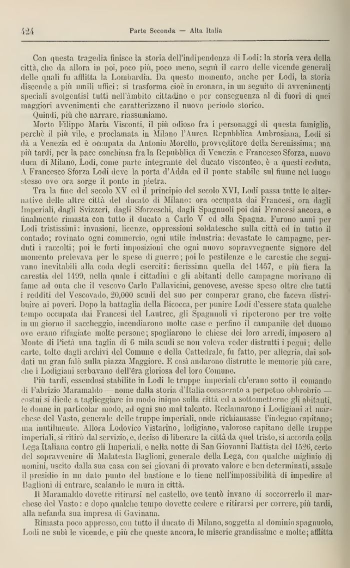 Tra la fine del secolo XV ed il principio del secolo XVI, Lodi [tassa tutte le alternative delle altre città del ducato di Milano: ora occupata dai Francesi, ora dagli Imperiali, dagli Svizzeri, dagli Sforzeschi, dagli Spagnuoli poi dai Francesi ancora, e finalmente rimasta con tutto il ducato a Carlo V ed alla Spagna. Furono anni per Lodi tristissimi. invasioni, licenze, oppressioni soldatesche sulla città ed in tutto il contado; rovinato ogni commercio, ogni utile industria: devastate le campagne, perduti 1 raccolti; poi le forti imposizioni che ogni nuovo sopravvegnente signore del momento prelevava per lo spese di guerre; poi le pestilenze e le carestie che seguivano inevitabili alla coda degli eserciti : Serissima quella del 1457, e più fieni la carestia del 1499, nella quale i cittadini e gli abitanti delle campagne morivano di fame ad onta che il vescovo Carlo Pallavicini, genovese, avesse speso oltre che tutti i redditi del Vescovado, 20,000 scudi del suo per comperar grano, che faceva distribuire ai poveri. Dopo la battaglia della Ricocca, per punire Lodi d'essere stata qualche tempo occupata dai Francesi del Lautrec, gli Spaglinoli vi ripeterono per tre volte in un giorno il saccheggio, incendiarono molte case e per,'ino il campanile del duomo ove erano rifugiate molte persone; spogliarono le chiese dei loro arredi, imposero al Monte di Pietà una taglia di G mila scudi se non voleva veder distrutti i pegni; delle carte, tolte dagli archivi del Comune e della Cattedrale, fu fatto, per allegria, dai soldati un gran falò sulla piazza Maggiore. E così andarono distrutte le memorie più care, che i Lodigiani serbavano dell'Ara gloriosa del loro Comune.