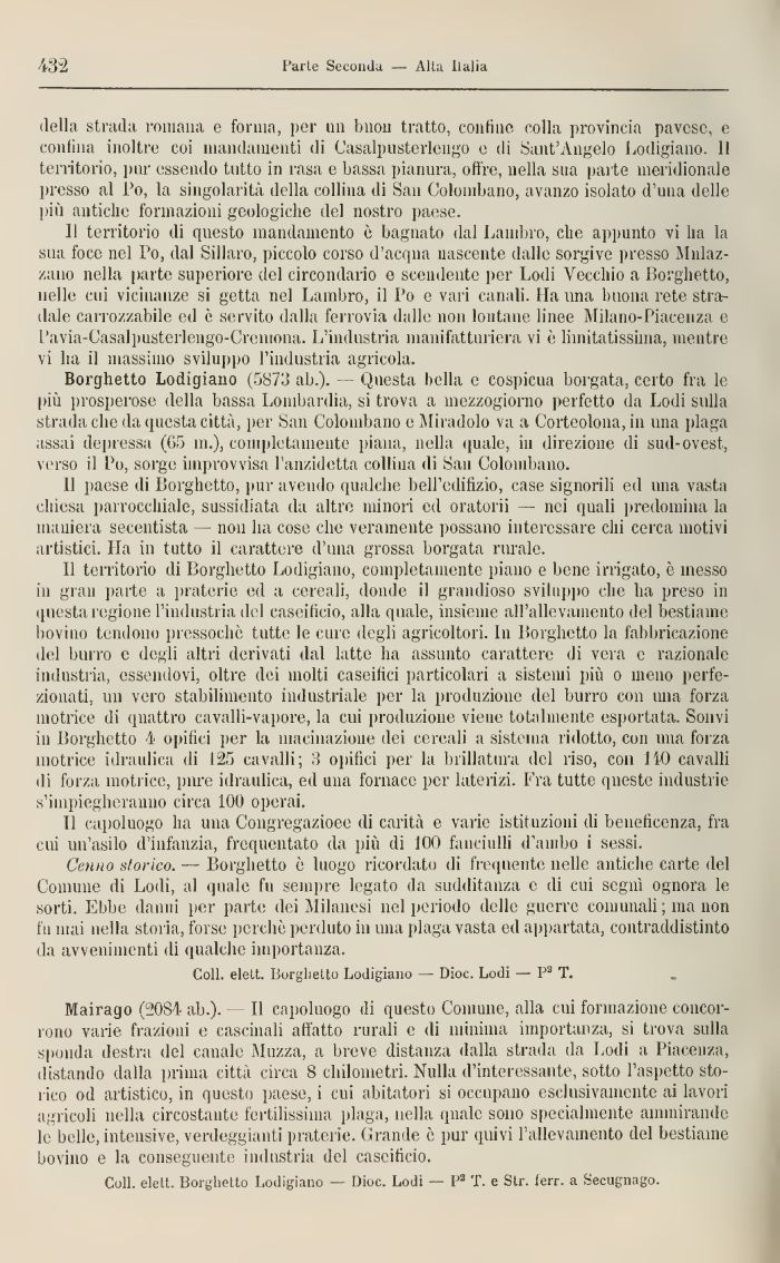 Mairago (20S4 ab.). Il capoluogo di questo Connine, alla cui formazione concorrono varie, frazioni e cascinali all'atto rurali e di minima importanza, si trova sulla sponda destra del canale Muzza, a breve distanza dalla strada da Lodi a Piacenza, distando dalla prima città circa 8 chilometri. Nulla d'interessante, sotto l'aspetto storico od artistico, in questo paese, i cui abitatori si occupano esclusivamente ai lavori agricoli nella circostante fertilissima plaga, nella quale sono specialmente ammirande le belle, intensive, verdeggianti praterie. Grande è pur quivi l'allevamento del bestiame bovino e la conseguente industria del caseificio.