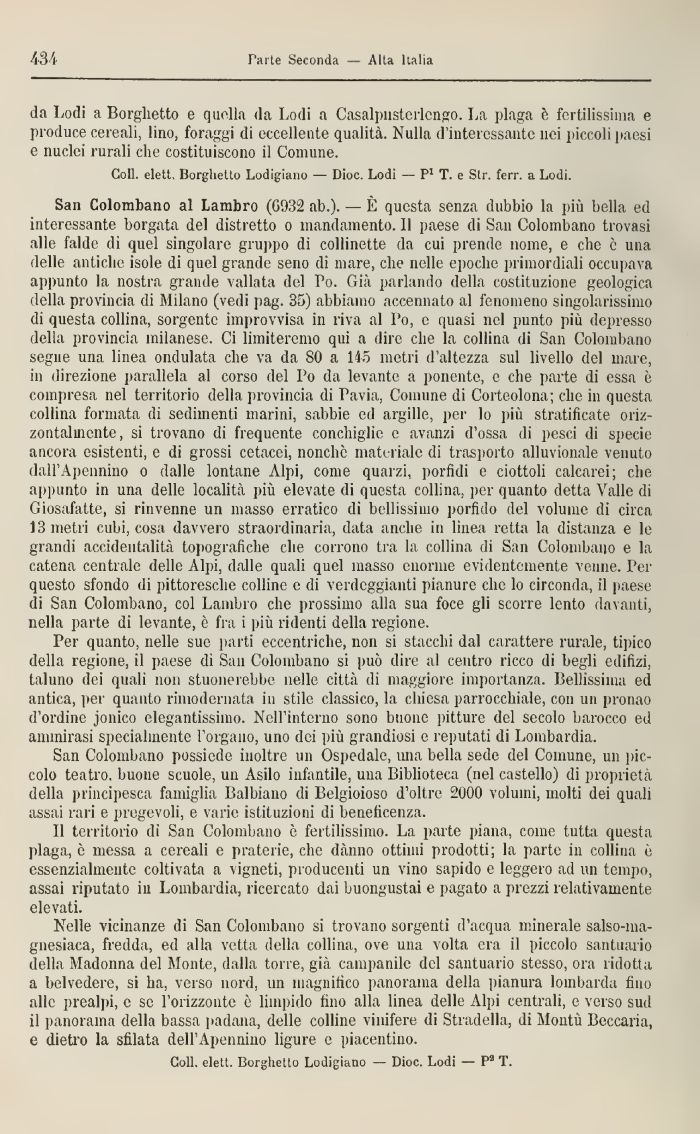 San Colombano al Lambro (0932 ab.). — È questa senza dubbio la più bella ed interessante borgata del distretto o mandamento. Il paese di San Colombano trovasi alle falde di quel singolare gruppo di collinette da cui prende nome, e che è una delle antiche isole di quel grande seno di mare, che nelle epoche primordiali occupava appunto la nostra grande vallata del Po. Già parlando della costituzione geologica della provincia di Milano (vedi pag. 35) abbiamo accennato al fenomeno singolarissimo di questa collina, sorgente improvvisa in riva al Po, e quasi nel punto più depresso della provincia milanese. Ci limiteremo qui a dire che la collina di San Colombano segue una linea ondulata che va da 80 a Ilo metri d'altezza sul livello del mare, in direzione parallela al corso del Po da levante a ponente, e che parte di essa è compresa nel territorio della provincia di Pavia, Comune di Corteolona; che in questa collina formata di sedimenti marini, sabbie ed argille, per lo più stratificate orizzontalmente, si trovano di frequente conchiglie e avanzi d'ossa di pesci di specie ancora esistenti, e di grossi cetacei, nonché materiale di trasporto alluvionale venuto dall'Apennino o dalle lontane Alpi, come quarzi, porfidi e ciottoli calcarei; che appunto in una delle località più elevate di questa collina, per quanto detta Valle di Giosafatte, si rinvenne un masso erratico di bellissimo porfido del volume di circa 13 metri cubi, cosa davvero straordinaria, data anche in linea retta la distanza e le grandi accidentalità topografiche che corrono tra la collina di San Colombano e la catena centrale delle Alpi, dalle quali quel masso enorme evidentemente venne. Per questo sfondo di pittoresche colline e di verdeggianti pianure che lo circonda, il paese di San Colombano, col Lambro che prossimo alla sua foce gli scorre lento davanti, nella parte di levante, è fra i più ridenti della regione.
