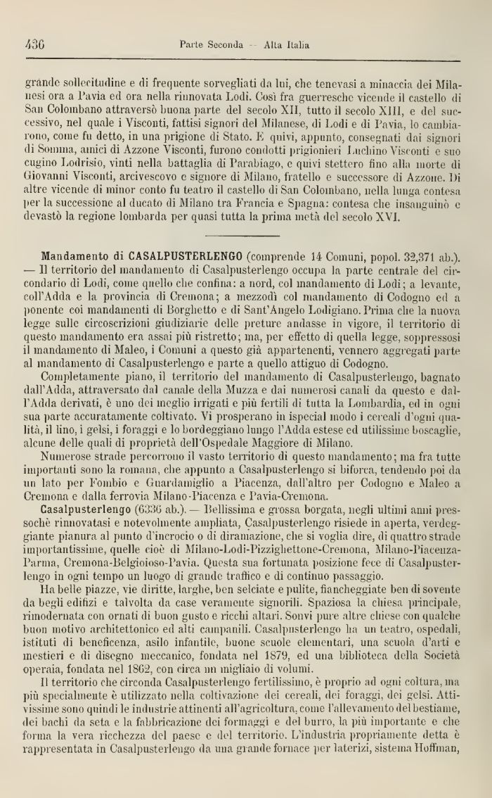 Casalpusterlengo (6336 ab.). — Bellissima e grossa borgata, negli ultimi anni pressoché rinnovatasi e notevolmente ampliata, Casalpusterlengo risiede in aperta, verdeggiante pianura al punto d'incrocio o di diramazione, che si voglia dire, di quattro strade importantissime, quelle cioè di Milano-Lodi-Pizzigliettone-Creniona, Milaiio-l'iacenza-Panna, Cremotia-Belgioioso-Pavia. Questa sua fortunata posizione fece di Casalpusterlengo in ogni tempo un luogo di grande traffico e di continuo passaggio.
