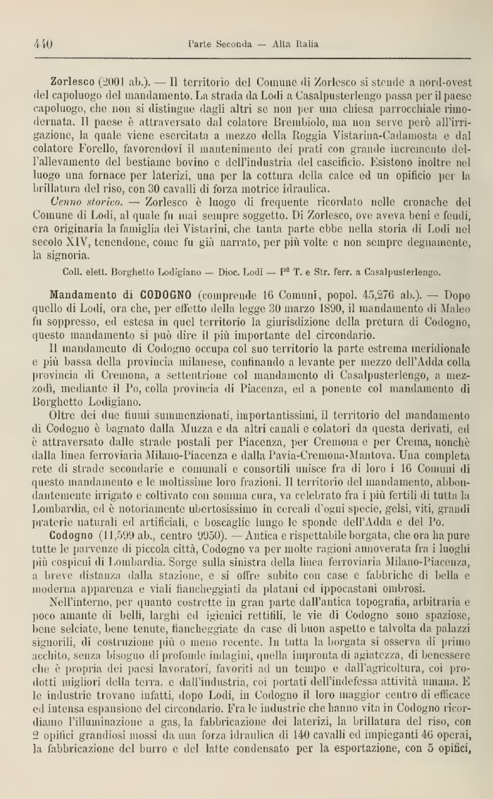 Zorlesco (2001 ab.). — Il territorio del Connine di Zorlesco si stende a nord-ovest del capoluogo del mandamento. La strada da Lodi a Casalpusterlengo passa per il paese capoluogo, che 11011 si distingue dagli altri se non per una chiesa parrocchiale rimodernata. Il paese è attraversato dal colatore Brenibiolo, ma non serve però all'irrigazione, la quale viene esercitata a mezzo della Roggia Vistarìna-Cadamosta e dal colatore Torello, favorendovi il mantenimento dei prati con grande incremento dell'allevamento del bestiame bovino e dell'industria del caseificio. Esistono inoltre nel luogo una fornace per laterizi, una per la cottura (lolla, calce ed un opificio per la brillatura del riso, con 30 cavalli di forza motrice idraulica.