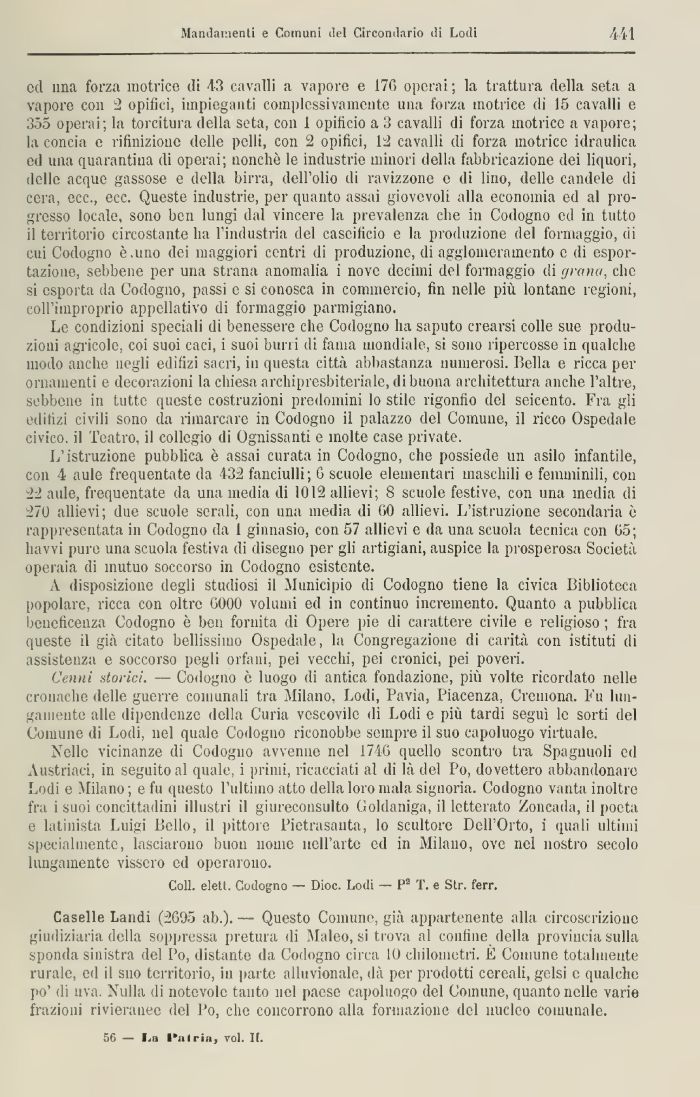 ed una forza motrice di 43 cavalli a vapore e 17G operai; la trattura della seta a vapore con 2 opifici, impieganti complessivamente una forza motrice di 15 cavalli e 355 operai; la torcitura della seta, con 1 opificio a 3 cavalli di forza motrice a vapore; la concia e rifiniziouc delle pelli, con 2 opifici, 12 cavalli di forza motrice idraulica ed una quarantina di operai; nonché le industrie minori della fabbricazione dei liquori, delle acque gassose e della birra, dell'olio di ravizzone e di lino, delle candele di cera, ecc., ecc. Queste industrie, per quanto assai giovevoli alla economia ed al progresso locale, sono ben lungi dal vincere la prevalenza che in Codogno ed in tutto il territorio circostante ha l'industria del caseificio e la produzione del formaggio, di cui Codogno è.uno dei maggiori centri di produzione, di agglonieramento e di esportazione, sebbene per una strana anomalia i nove decimi del formaggio di grana, che si esporta da Codogno, passi e si conosca in commercio, fin nelle più lontane regioni, coll'improprio appellativo di formaggio parmigiano.