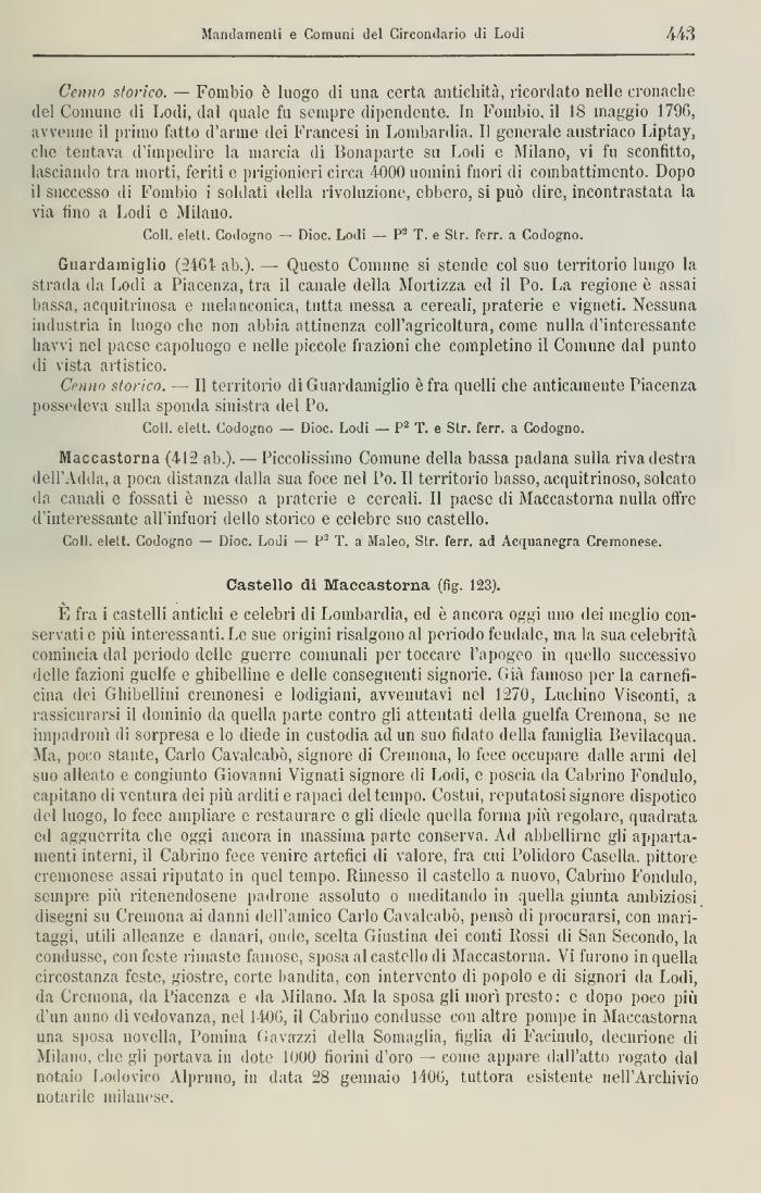 E fra i castelli antichi e celebri di Lombardia, ed è ancora oggi uno dei meglio conservati e pili interessanti. Le sue origini risalgono al periodo feudale, ma la sua celebrità comincia dal periodo delle guerre comunali per toccare l'apogeo in quello successivo delle fazioni guelfe e ghibelline- e delle conseguenti signorie. Già famoso per la carneficina dei Ghibellini cremonesi e lodigiani, avvenutavi nel 1270, Luchino Visconti, a rassicurarsi il dominio da quella parte contro gli attentati della guelfa Cremona, se ne impadronì di sorpresa e lo diede in custodia ad un suo fidato della famiglia Bevilacqua. Ma, poco stante, Cario Cavale,abò, signore di Cremona, lo fece occupare dalle armi del suo alleato e congiunto Giovanni Vignati signore di Lodi, e poscia da Cabrino Fornitilo, capitano di ventura dei più arditi e rapaci del tempo. Costui, reputatosi signore dispotico del luogo, lo fece ampliare e restaurare e gli diede quella forma più regolare, quadrata ed agguerrita che oggi ancora in massima parte conserva. Ad abbellirne gli appartamenti interni, il Cabrino fece venire artefici di valore, fra cui Polidoro Casella, pittore cremonese assai riputato in quel tempo. Rimesso il castello a nuovo, Cabrino Fornitilo, sempre più ritenendosene padrone assoluto o meditando in quella giunta ambiziosi disegni su Cremona ai danni dell'aulico Carlo Cavalcai»), pensò di procurarsi, con maritaggi, utili alleanze e danari, onde, scelta Giustina dei conti Rossi ili San Secondo, la condusse, con feste rimaste famose, sposa al castello di Maccastorna. Vi furono in quella circostanza feste, giostre, corte bandita, con intervento di popolo e di signori da Lodi, da Cremona, da Piacenza e da Milano. Ma la sposa gli morì presto: e dopo poco più d'un armo di vedovanza, nel 1400, il Cabrino condusse con altre pompe in Maceastorna una sposa novella, Pomina Gavazzi della Somaglia, figlia dì Famulo, decurione di Milano, clic gii portava in dote 1000 fiorini d'oro — come appare dall'atto rogato dal notaio Lodovico Alprnno, in data 28 gennaio 1400, tuttora esistente nell'Archivio notarile milanese.