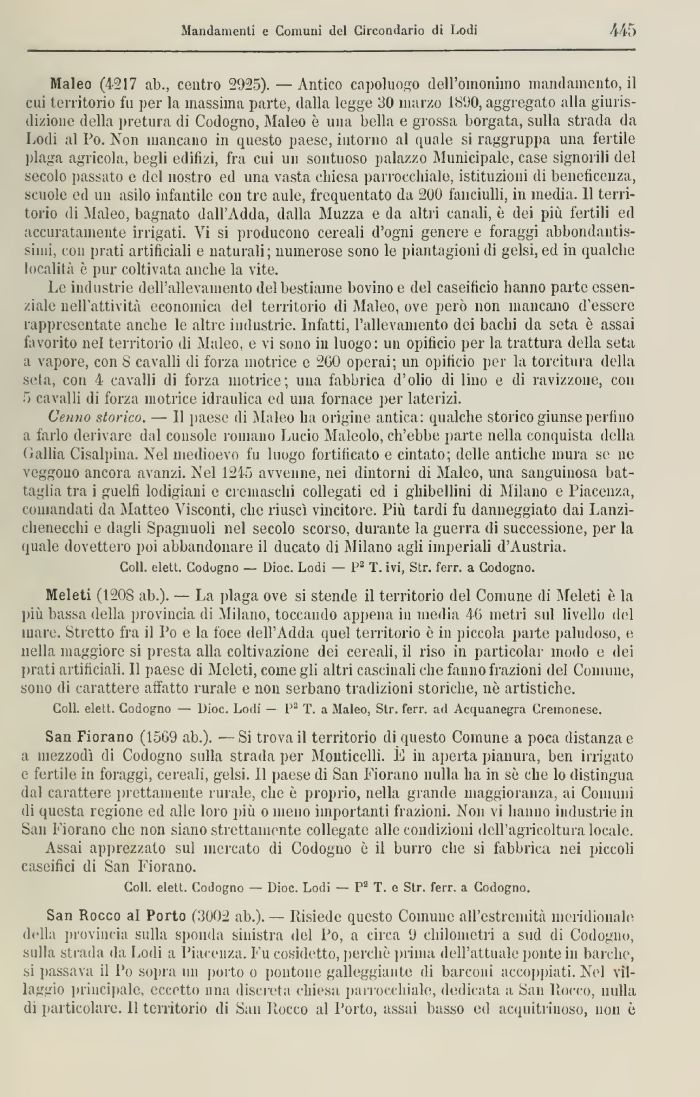 Maleo (4217 ab., centro 2925). — Antico capoluogo dell'omonimo mandamento, il cui territorio fu per la massima parte, dalla legge 30 marzo 1890, aggregato alla giurisdizione della pretura di Codogno, Maleo è una bella e grossa borgata, sulla strada da Lodi al Po. Non mancano in questo paese, intorno al quale si raggruppa una fertile plagi agricola, begli edifizi, fra cui un sontuoso palazzo Municipale, case signorili del secolo passato e dei nostro ed una vasta chiesa parrocchiale, istituzioni di beneficenza, scuole ed un asilo infantile con tre aule, frequentato da 200 fanciulli, in media. 11 territorio di Maleo, bagnato dall'Adda, dalla Muzza e da altri canali, è dei più fertili ed accuratamente irrigati. Vi si producono cereali d'ogni genere e foraggi abbondantissimi, con prati artificiali e naturali; numerose sono le piantagioni di gelsi, ed in qualche località è pur coltivata anche la vite.