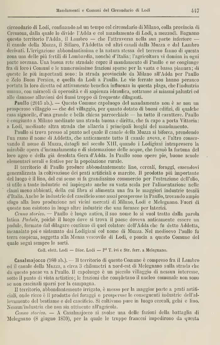 circondario di Lodi, confinando ad un tempo col circondario di Milano, colla provincia dì Cremona, dalla quale lo divide l'Adda e col mandamento di Lodi, a mezzodì. Bagnano questo territorio l'Adda, il Bandirò — che l'attraversa nella sua parte inferiore — il canale della Muzza, il Sillaro, l'Addetta ed altri canali dalla Muzza e dal Lambro derivati. L'irrigazione abbondantissima e la natura stessa del terreno fanno di questa zona una delle più fertili di Lombardia, nonché d'Italia; l'agricoltura vi domina in ogni parte sovrana. Una buona rete stradale copre il mandamento di Ballilo e ne congiunge fra di loro i Comuni e le numerosissime frazioni sparse per la vasta e bassa pianura; di queste le più importanti sono : la strada provinciale da Milano all'Adda per Ballilo e Zelo Buon Persico, e quella da Lodi a Panilo. Le vie ferrate non hanno peranco portata la loro diretta ed attivamente benefica influenza in questa plaga, che l'industria umana, con miracoli di operosità e di sapienza idraulica, sottrasse ai miasmi palustri ed alle dannose alluvioni dei fiumi troppo di frequente dilaganti.