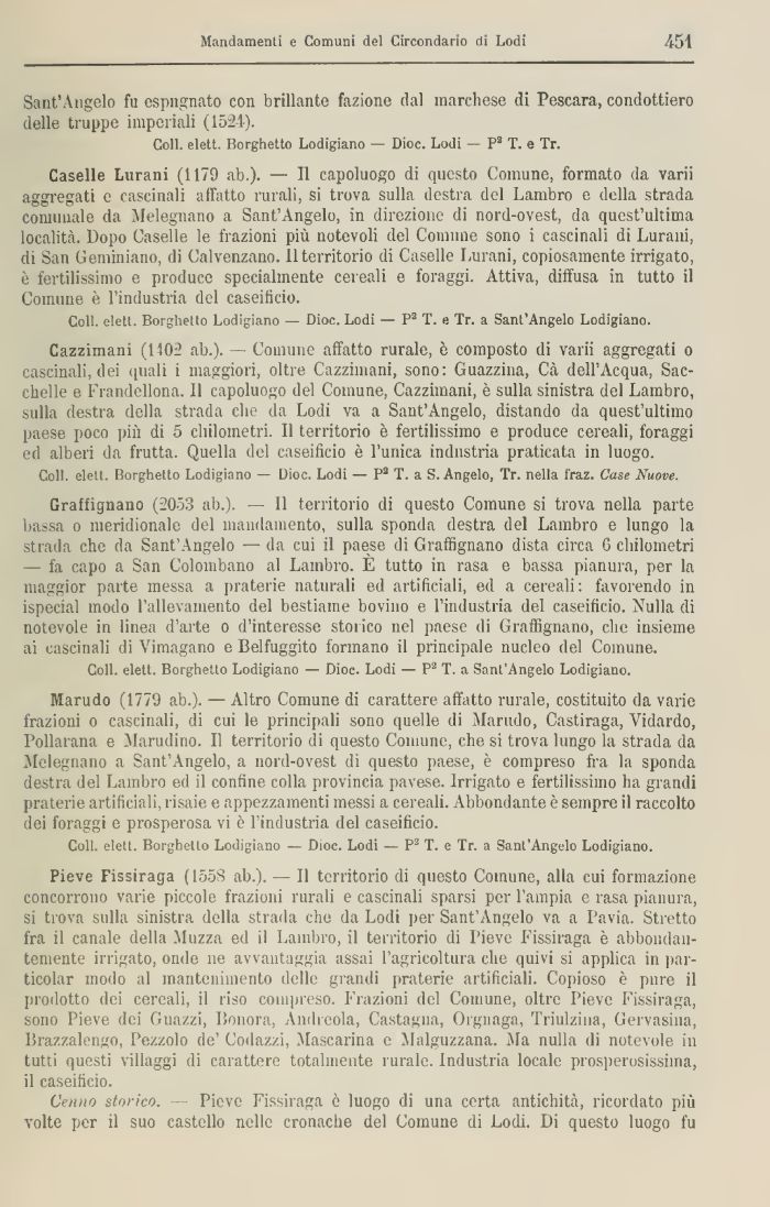 Cazznnani (1102 ab.). — Comune affatto rurale, è composto di varii aggregati o cascinali, dei quali i maggiori, oltre Cazzimani, sono: Guazzimi, Cà dell'Acqua, Sac-chelle e Frandellona. Il capoluogo del Comune, Cazzimani, è sulla sinistra del Lambro, sulla destra della strada che da Lodi va a Sant'Angelo, distando da quest'ultimo paese, poco più di 5 chilometri. Il territorio è fertilissimo e produce cereali, foraggi ed alberi da frutta. Quella del caseificio è l'unica industria praticata in luogo.