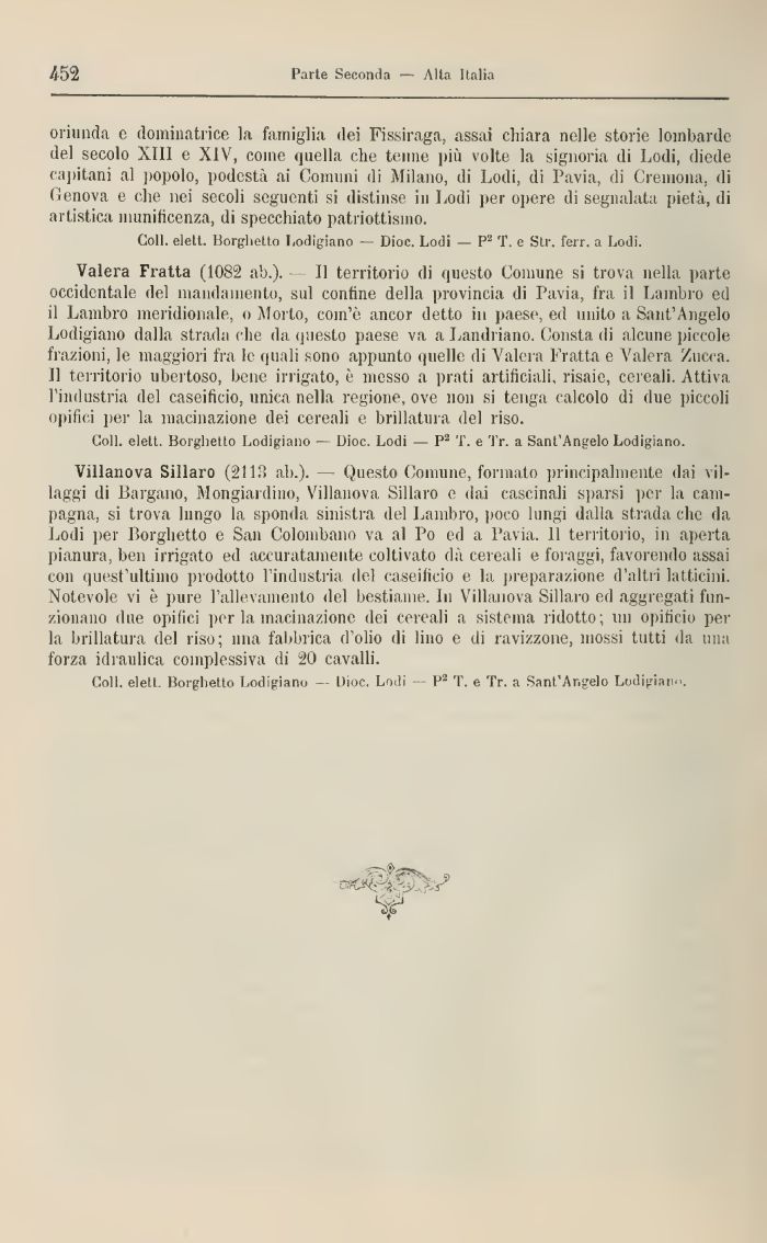 Valera Fratta (1082 ab.). Il territorio di questo Comune si trova nella parte occidentale del mandamento, sul confine della provincia di Pavia! fra il Lambro ed il Lambro meridionale, o Morto, com'è ancor detto 111 paese, ed unito a Sant'Angelo Lodigiani) dalla strada che da questo paese va a Landriano. Consta di alcune piccole frazioni, le maggiori fra le quali sono appunto quelle di Yalera Fratta e Valera Zucca. Il territorio ubertoso, bene irrigato, è messo a prati artificiali, risaie, cereali. Attiva l'industria del caseificio, unica nella regione, ove non si tenga calcolo di due piccoli opifici per la macinazione dei cereali e brillatura del riso.