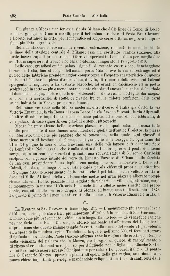 Bellissime vie sono nella Monza moderna, oltre il corso d'Italia già detto, la via Vittorio Emanuele, la via Roma, il corso Lecco, la via Azzone Visconti, la via Aliprandi, ed altre di minore importanza, ma non meno pulite, ed adorne di bei fabbricati, di veri palazzi, di case signorili, con giardini e sfondi pittoreschi.