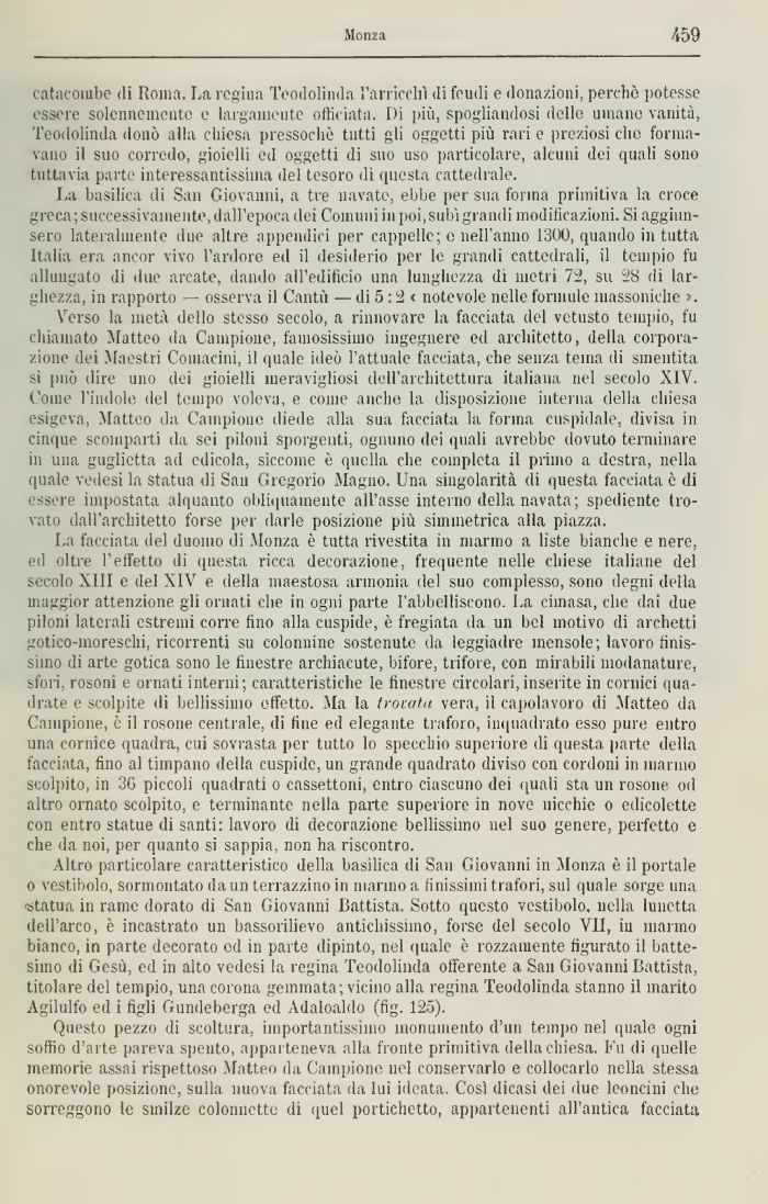 La facciata del duomo di Monza è tutta rivestita in marmo a liste bianche e nere, ed oltre l'effetto di questa ricca decorazione, frequente nelle chiese italiane del secolo XIII e del XIV e della maestosa armonia del suo complesso, sono degni della maggior attenzione gli ornati che in ogni parte l'abbelliscono. La cimasa, che dai due piloni laterali estremi corre tino alla cuspide, è fregiata da un bel motivo di archetti gotico-moreschi, ricorrenti su colonnine sostenute da leggiadre mensole; lavoro finissimo di arte gotica sono le finestre archiacute, bifore, trifore, con mirabili modanature, sfori, rosoni e ornati interni; caratteristiche le finestre circolari, inserite in cornici quadrate e scolpite ili bellissimo effetto. Ma la trovata vera, il capolavoro di Matteo da Campione, è il rosone centrale, di fine ed elegante traforo, inquadrato esso pure entro una cornice quadra, cui sovrasta per tutto lo specchio superiore ili questa parte della facciata, fino al timpano della cuspide, un grande quadrato diviso con cordoni in marino scolpito, in 30 piccoli quadrati o cassettoni, entro ciascuno dei quali sta un rosone od altro ornato scolpito, e terminante nella parte superiore in nove nicchie o edicolette con entro statue di santi lavoro di decorazione bellissimo nel suo genere, perfetto e che da noi, per quanto si sappia, non ha riscontro.