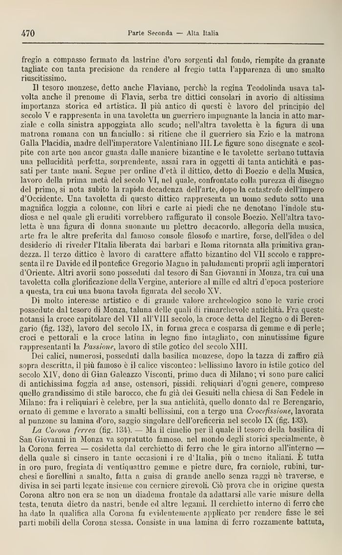 La Corona ferrea (fig. 134). — Ma il cimelio per il quale il tesoro della basilica di San Giovanni in Monza va sopratutto famoso, nel inondo degli storici specialmente, è la Corona ferrea — cosidetta dal cerchietto di ferro che le gira intorno all'interno — della quale si cinsero in tante occasioni ì re d'Italia, più o meno italiani. E tutta in oro puro, fregiata di ventiquattro gemme e pietre dure, fra corniole, rubini, turchesi e fiorellini a smalto, fatta a guisa di grande anello senza raggi nò traverse, e divisa ìli sei parti legate insieme con cerniere girevoli. Ciò prova che in origine questa Corona altro non era se non un diadema frontale da adattarsi alle varie misure della testa, tenuta dietro da nastri, bende ed altre legami. Il cerchietto interno di ferro che ha dato la qualifica alla Corona fu evidente ni ente applicato per rendere fisse le sei parti mobili della Corona stessa. Consiste in una lamina di ferro rozzamente battuta,