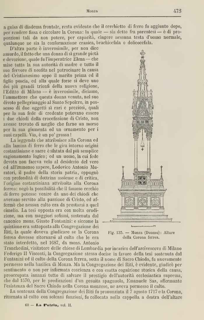 La leggenda che attribuisce alla Corona ed alla lamina di ferro che le gira intorno origini costantiniane e sacre è sfatata dal più semplice ragionamento logico ; ed un uomo, la cui fede devota non faceva velo al desiderio del vero ed all'immenso sapere, Lodovico Antonio Muratori, il padre della storia patria, oppugnò con profondità di dottrina assieme e di critica, l'origine costantiniana attribuita alla Corona ferrea: negò la possibilità che il famoso cerchio di ferro potesse venire da uno dei chiodi che avevano servito alla passione di Cristo, ed affermò che nessun culto era da prestarsi a quel cimelio. La tesi opposta era con molta erudizione, ma con maggiori sofismi, sostenuta dal canonico rnons. Giusto Fontanini: e siccome la quistioneera sottoposta alla Congregazione dei Ititi, la quale doveva giudicare se la Corona Fig. 135. — Monza (Duomo): Altare ferrea dovesse ritornarsi al culto che le era della Corona ferrea,