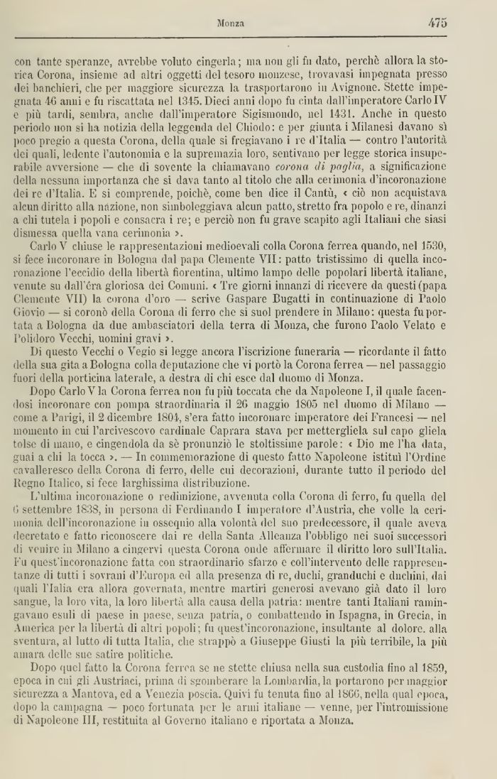 con tante speranze, avrebbe voluto cingerla ; ma non gli fn dato, perchè allora la storica Corona, insieme ad altri oggetti del tesoro monzese, Irovavasi impegnata presso dei banchieri, che per maggiore sicurezza la trasportarono in Avignone. Stette impegnata 46 anni e fu riscattata nel 1345. Dieci anni dopo fu cinta dall'imperatore Carlo IV e più tardi, sembra, anche dall'imperatore Sigismondo, nel 1431. Anche in questo periodo 11011 si ha notizia della leggenda del Chiodo: e per giunta i Milanesi davano sì poco pregio a questa Corona, della quale si fregiavano i re d'Italia — contro l'autorità dei quali, ledente l'autonomia e la supremazia loro, sentivano per legge storica insuperabile avversione — che di sovente la chiamavano corona di paglia, a significazione della nessuna importanza che si dava tanto al titolo che alla cerimonia d'incoronazione dei re d'Italia. E si comprende, poiché, come ben dice il Cantò, < ciò non acquistava alcun diritto alla nazione, non simboleggiava alcun patto, stretto fra popolo e re, dinanzi a chi tutela i popoli e consacra i re; e perciò non fn grave scapito agli Italiani che siasi dismessa quella vana cerimonia >.