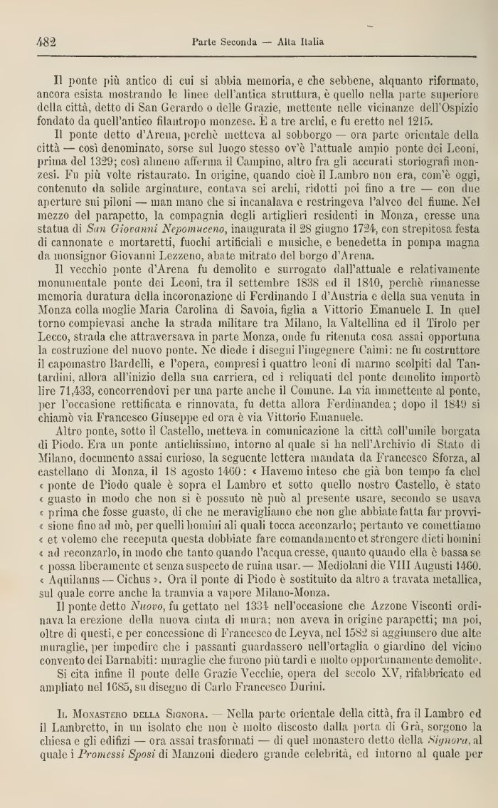 Il vecchio pone d'Arena fu demolito e surrogato dall'attuale e relativamente monumentale ponte dei Leoni, tra il settembre 1838 ed il 1810, perchè rimanesse memoria duratura della incoronazione di Ferdinando I d'Austria e della sua venuta in Monza colla moglie Maria Carolina di Savoia, figlia a Vittorio Emanuele I. In quel torno comprovasi anche la strada militare tra Milano, la Valtellina ed il Titolo per Lecco, strada che attraversava in parte Monza, onde fu ritenuta cosa assai opportuna la costruzione del nuovo ponte. Ne diede i disegni l'ingegnere Caìmì: ne fu costruttore il capomastro Lardelli, e l'opera, compresi i quattro leoni di marmo scolpiti dal Tan-tardine, allora all'inizio della sua carriera, ed i reliquati del ponte demolito importò lire 71,433, concorrendovi per una parte anche il Comune. La via immettente al ponte, l>er l'occasione rettificata e rinnovata, fu detta allora Ferdinantlea ; dopo il 1849 si chiamò via Francesco Giuseppe ed ora è via Vittorio Emanuele.