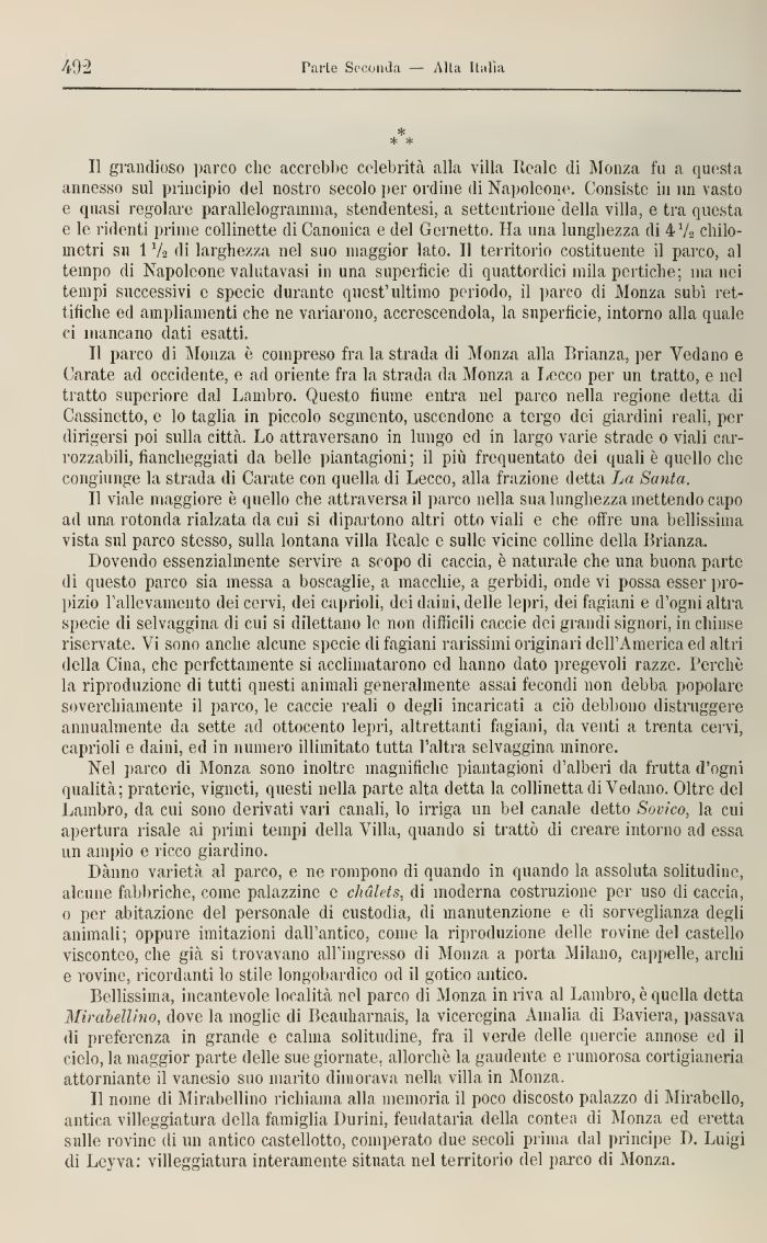 Il grandioso parco elio accrebbe celebrità alla villa Reale di Monza fu a questa, annesso sul principio del nostro secolo per ordine di Napoleone. Consiste in un vasto e quasi regolare parallelogramma, stendentesi, a settentrione della villa, e tra questa e le ridenti prima collinette dì Canonica e del Cornetto. Ila una lunghezza di 4 Va chilometri su 1 Va di larghezza nel suo maggior lato. Il territorio costituente il parco, al tempo di Napoleone valutatasi in una superficie di quattordici mila pertiche; ina nei tempi successivi e specie durante quest'ultimo periodo, il pareo di Monza subì rettifiche ed ampliamenti che ne variarono, accrescendola, la superficie, intorno alla quale ci mancano dati esatti.