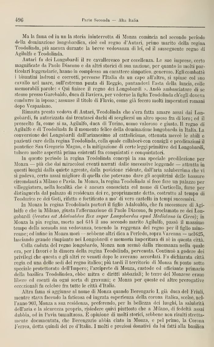 In Monza la regina Teodolinda partorì il tìglio Adaloaldo, che fu successore di Agilulfo e che in Milano, giusta l'affermazione di Paolo Diacono, fu proclamato re dei Longobardi (levatus est Adaloaldus lì ex super Longobardos a pud Medialano in Circo); in Monza la pia regina, morto nel f> 1 % il suo secondo marito Agilulfo, passò il massimo tempo della seconda sua vedovanza, tenendo la reggenza del regno per il tìglio minorenne; ed infine in Monza morì — sebbene altri dica a Periodo, sopra V arenila — nel (125, lasciando grande rimpianto nei Longobardi e memoria imperitura di se in questa città.