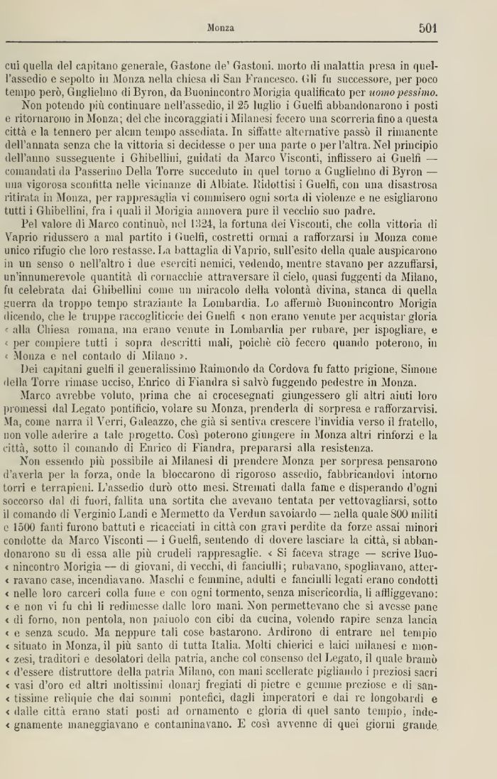 Non potendo più continuare nell'assedio, il 25 luglio i Guelfi abbandonarono i posti e ritornarono in Monza; del che incoraggiati i Milanesi fecero una scorreria fino a questa città e la tennero per alcun tempo assediata. In siffatte alternative passò il rimanente dell'annata senza che la vittoria si decidesse o per una parte o per l'altra. Nel principio dell'anno susseguente 1 Ghibellini, guidati da Marco Visconti, inflissero ai Guelfi — comandati da Passerino Della Torre succeduto m quel torno a Guglielmo di Byron — una vigorosa sconfitta nelle vicinanze di Albiate. Bidottisi i Guelfi, con una disastrosa ritirata in Monza, per rappresaglia \ì commisero ogni sorta di violenze e ne esigiiarono tutti i Ghibellini, fra i quali il Morigia annovera pure il vecchio suo padre.