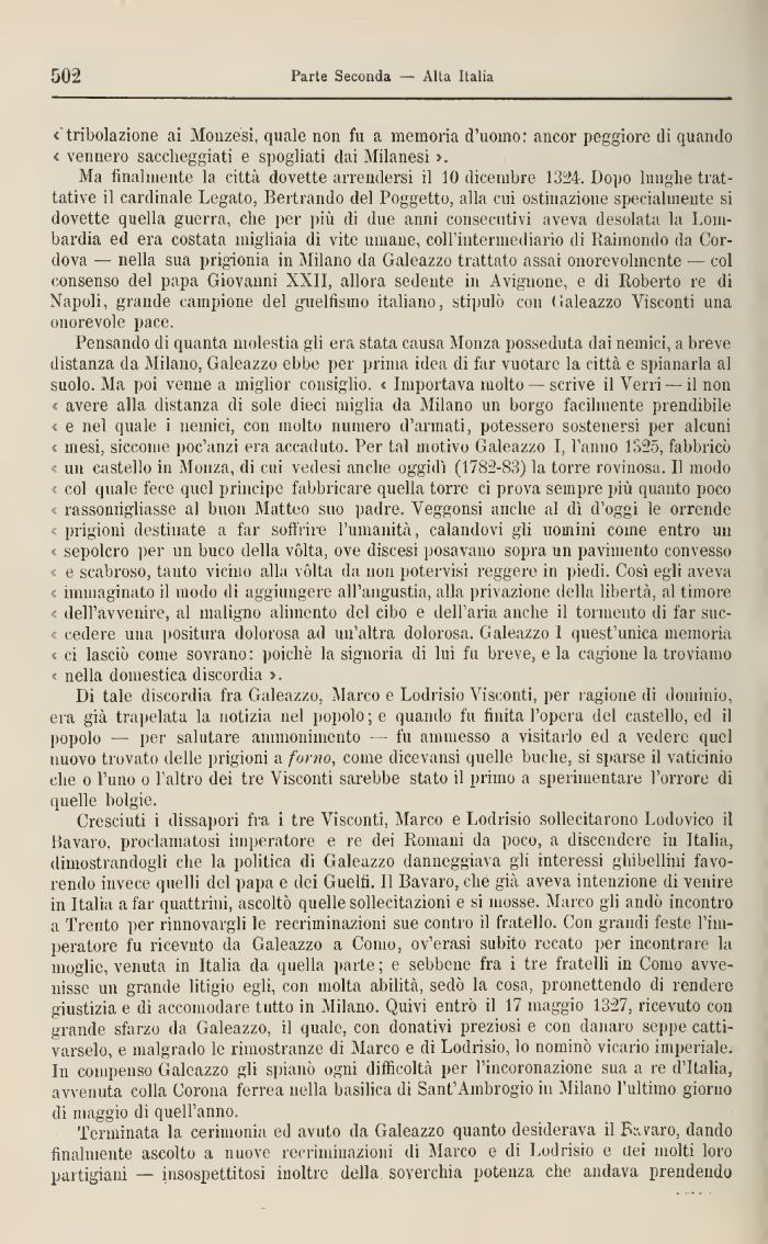 < mesi, siccome poc'anzi era accaduto. Per tal motivo Galeazzo I, l'anno 1325, fabbricò « un castello in Monza, di cui vedesi anche oggidì (1782-83) la torre rovinosa. Il modo « col quale fece quel principe fabbricare quella torre ci prova sempre più quanto poco « rassomigliasse al buon Matteo suo padre. Veggonsi anche al dì d'oggi le orrende « prigioni destinate a far soffrire l'umanità, calandovi gli uomini come entro un
