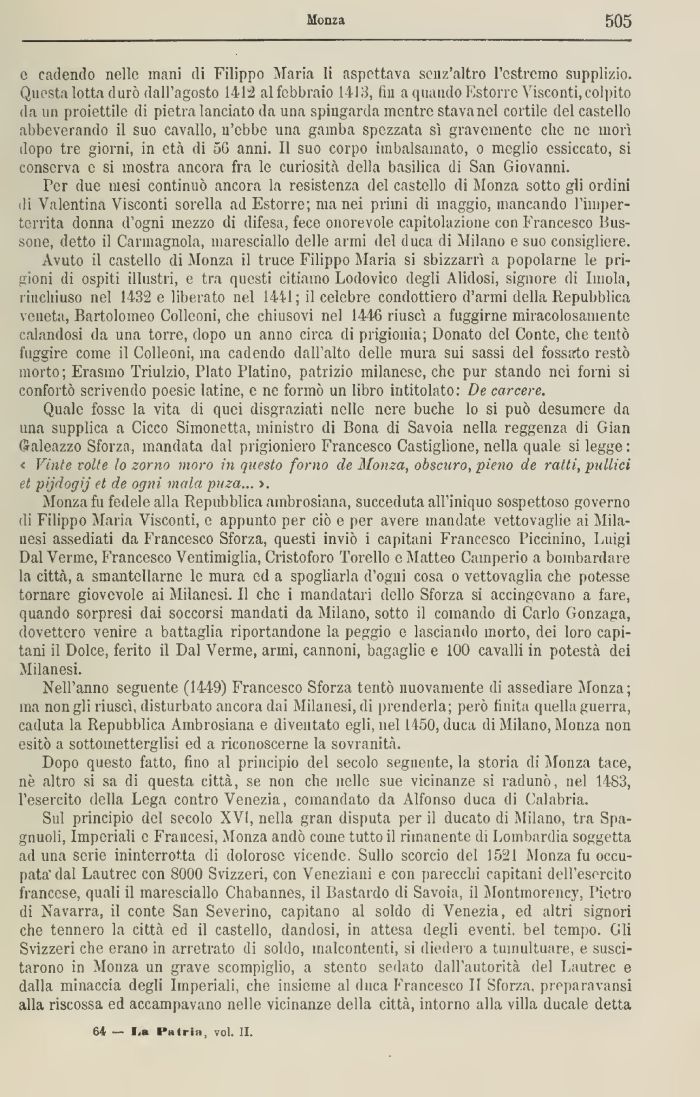 Avuto il castello di Monza il truce Filippo Maria si sbizzarrì a popolarne le prigioni di ospiti illustri, e tra questi citiamo Lodovico degli Alidosi, signore di Imola, rinchiuso nel 1432 e liberato nel 1441; il celebre condottiero d'armi della Repubblica veneta, Bartolomeo Colleoni, che chiusovi nel 1446 riuscì a fuggirne miracolosamente calandosi da una torre, dopo un anno circa di prigionia; Donato del Conte, che tentò fuggire come il Colleoni, ma cadendo dall'alto delle mura sui sassi del fossato restò morto ; Erasmo Triulzio, Plato Platino, patrizio milanese, che pur stando nei forni si confortò scrivendo poesie latine, e ne formò un libro intitolato: De carcere.