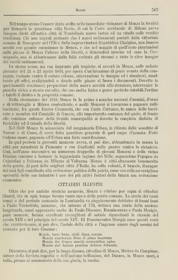 Oltre che per antiche storiche memorie, Monza è celebre per copia di cittadini illustri, che in ogni tempo furono vanto suo e della patria comune. La storia dei bassi tempi e del periodo comunale in Lombardia va singolarmente debitrice di buoni lumi a Paolo Varnefrido, monzese, che intorno al 770, dettava una storia della nazione longobarda, assai apprezzata anche da Paolo Diacono; Buonincontro e Paolo Morigia, pure monzesi, furono eccellenti raccoglitori di notizie riguardanti le vicende del secolo XIII e del principio del secolo XIV. Di Buonincontro Morigia sono questi versi che caratterizzano, si può dire, l'indole della città e l'ingenuo amore degli uomini del trecento per il loro Comune :