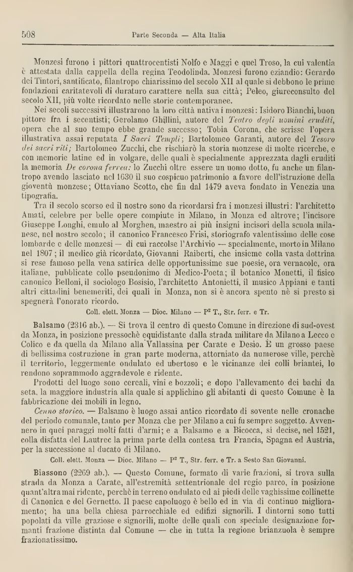 Balsamo (2310 ab.). — Sì trova il centro di questo Comune in direzione di sud-ovest da Alonza, in posizione pressoché equidistante dalla strada militare da Milano a Lecco e Colico e da quella da Milano alla Vallassina per Carate e Desio. È un grosso paese di bellissima costruzione in gran parte moderna, attorniato da numerose ville, perchè il territorio, leggermente ondulato ed ubertoso e le vicinanze dei colli briantei, lo rendono soprammodo aggradevole, e ridente.