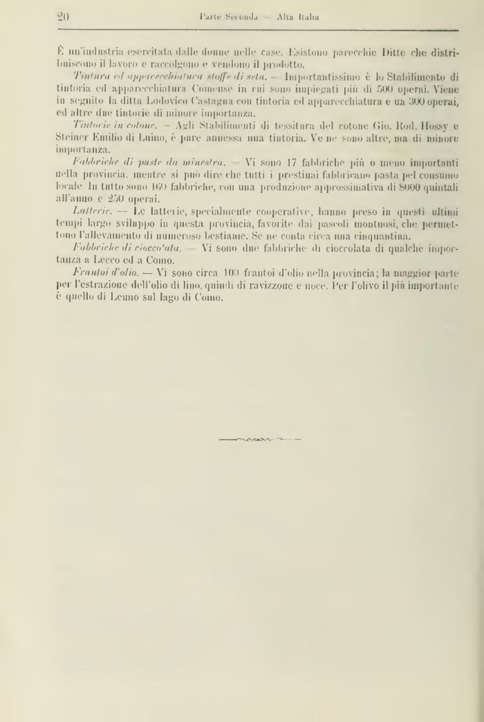 Frantoi d'olio. — Vi sono circa 10U frantoi d'olio nella provincia; la maggior parte per l'estrazione dell'olio di lino, quindi di ravizzone e noce, l'or l'olivo il pili importante è quello di Leuno sul lago di Como.