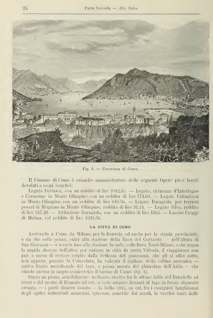 Arrivando a Conio da Milano, per la ferrovia, od anche per la strada provinciale, e sia che colla prima, entri alla stazione della linea del Gottardo nell'altura di San Giovanni — o scenda tino alla stazione lacuale, colla linea Nord-Milano, o che segua la rapida discesa dell'altra per entrare in città da porta Vittoria, il viaggiatore non può a meno di restare colpito dalla bellezza del panorama, che sii si olire sotto, non appena, passata la Camerlata, ha valicato il ciglione della collina morenica — antica fronte meridionale del lago, e prima ancora del ghiacciaio dell Ydda — che chiude ancora in ampio semicerchio il bacino di Como (tig. 1).