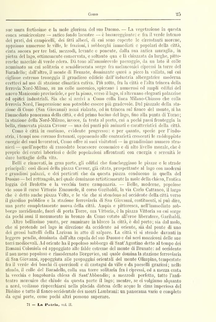 C'orno è città in continuo, evidente progresso: e per quanto, specie per l'industria, i tempi non corrano fortunati, opponendo alle contrarietà crescenti le raddoppiate energie dei suoi lavoratori, Como offre ai suoi visitatori— in grandissimo numero stranieri — quell'aspetto di rassodato benessere economico e di alto livello morale, clic è proprio dei centri laboriosi e delle popolazioni affrontanti con energia e serenità le dure battaglie della vita.