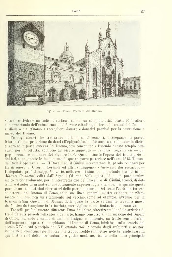 Tre stili profondamente differenti l'uno dall'altro, sintetizzanti l'indole artistica di tre differenti periodi nella storia dell'arte, hanno concorso alla formazione del Duomo di Como, lasciando ciascuno di essi, nell'insigne monumento, un tratto sensibilissimo dell impronta propria. Ci spieghiamo. Il Duomo di C'orno, iniziatosi sullo scorcio dei secolo XIV e sul principio del XV, quando cioè la scuola degli architetti e scultori lombardi o coinacini, ribellandosi alle troppo fredde simmetrie gotiche, esplieavasi in quello stile ch'è detto neo-lombardo o gotico moderno, risente nella linea principale
