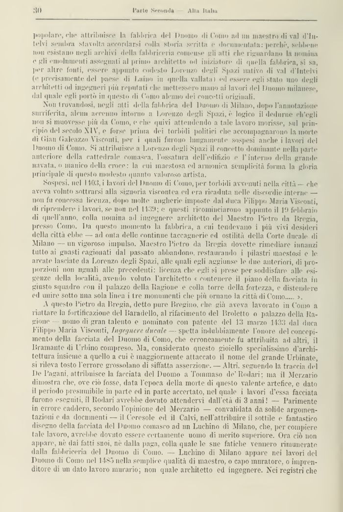 A questo Pietro da Pregia, detto pure Pregino, che già aveva lavorato in Como a riattare la fortificazione del Paradello, al rifacimento del Proietto o palazzo della Ragione nomo di gran talento e nominato con patente del Pi marzo 1433 dal duca Filippo Maria Visconti, ingegnere ducale — spetta indubbiamente l'onore del concepimento della facciata del Duomo di Como, che erroneamente fu attribuita ad altri, il Bramante di Urbino compreso. Ma, considerato questo gioiello specialissimo d'architettura insieme a quello a cui è maggiormente attaccato il nome del grande Urbinate, si rileva tosto l'errore grossolano di siffatta asserzione. — Altri, seguendo la traccia del De Pagani, attribuisce la facciata del Duomo a Tommaso de'Rodali: ma il Merzario dimostra che, ove ciò fosse, data l'epoca della morte di questo valente artefice, e dato il periodo presumibile in parte ed in parte accertato, nel quale i lavori d'essa facciata furono eseguiti, il lìodari avrebbe dovuto attendervi dall'età di 3 anni ! — Parimente in errore caddero, secondo l'opinione del Merzario — convalidata da solide argomentazioni e da documenti — il C'eresole ed il Calvi, nell'attribnire il sottile e fantastico disegno della facciata del Duomo comasco ad un Luchino di Milano, che, per compiere tale lavoro, avrebbe dovuto essere certamente uomo di merito superiore. Ora ciò non appare, nò dai fatti suoi, nò dalla paga, colla quale le sue fatiche vennero rimunerate, dalla fabbriceria del Duomo di Como. — Luchino di Milano appare nei lavori del Duomo di Como nel 11 Sò nella semplice qualità di maestro, o capo muratore, o imprenditore di un dato lavoro murario; non quale architetto ed ingegnere. Nei registri che
