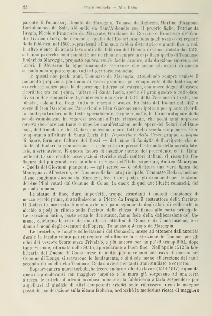 parente di rommaso; Donato da Mareggia, Tomaso da Righezio, Martino d'Annone, Rartoloninieo da Sala, \bbuudio da Sant'Abbondio con il ,iro]irìo figlio, l'etri no da Bregia, Nicolò e Francesco da Margrate, Gerolamo da Rezzano e Francesco dr'Yen-drelti: nomi tutti, che insieme a quello del Rodali, appaiono negli avanzi dei registri della fabbrica, nel 1500, sopra vissuti airumana rabbia distruttrice e giunti fino a noi. In altro elenco di artisti lavoranti alla fabbrica del Duomo di Como, datato dal 1513, si hanno parecchi nomi cambiati; ma ne rimane sempre in capolinea quello di Tommaso Rodar, da Mareggia, preposto ognora, com'è facile arguire, alla direzione Suprema dei lavori. Il Merzario fa opportunamente osservare che anche gli artisti di questa Seconda nota appartengono tutti al territorio comacino.