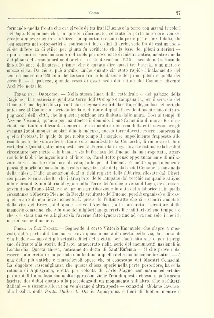 Tobhe deli,' Orologio. — Nella stessa linea della cattedrale e del palazzo della. Ragione è. la massiccia e quadrata torre dell'Orologio e campanaria, per il servizio del Duomo. E uno degli edilizi più antichi e ragguardevoli della città, col legandosi nel periodo anteriore al Connine al periodo feudale, durante il (piale fu evidentemente uno (lei propugnacoli della città, che in questa posizione era limitata dalle mura. Così ai tempi di Azzone Visconti, quando per mantenere il dominio, Como fu munita di nuove fortificazioni, non tanto a difesa dei nemici esterni quanto: a minaccia della città stessa per gli eventuali suoi impulsi popolari d'indipendenza, questa torre dovette essere compresa in (pielite fortezza, la quale fu per molto tempo il maggiore impedimento frapposto allo esaudimento del voto ardente, tante volte manifestato dai Comaschi, di rinnovare la loro cattedrale. Quando, ottenuta questa facoltà, Pierino da Pregia dovette sistemare la località circostante per mettere in buona Osta la facciata del Duomo da lui progettata, atterrando le fabbriche ingombranti all'intorno, l'architetto pensò opportunamente di utilizzare la vecchia torre ad uso di campanile per il Duomo: e molto opportunamente pensò di unirla in una sola linea colla nuova facciata del palazzo del Connine, e con quella della chiesa. Dalle annotazioni degli antichi registri della fabbrica, rilevate dal Ciceri, con paziento cura, risulta che il trasporto delle timpano dai vecchio campanile attiguo alla chiesa di Santa Alal ia Maggiore alla Torre dell'orologio verso il Lago, deve essere avvenuto nell'anno 1463, e che anzi una gratificazione fu data dalla fabbriceria in quella circostanza a Maestro Pierino da Pregia architetto del Duomo, perchè organizzò e diresse quel lavoro di non lieve momento.,2S questo fu l'ultimo atto che si riscontri annotato della vita del Pregia, del quale scrive l'Angelucci. altro accurato ricercatore delle memorie cornatine, che < fu uno dei migliori ingegneri civili e militari del suo tempo » e che « è stata una vera ingiustizia l'averne fatto ignorare lino ad ora non solo i ineriti, ma fin' anche il nome ».
