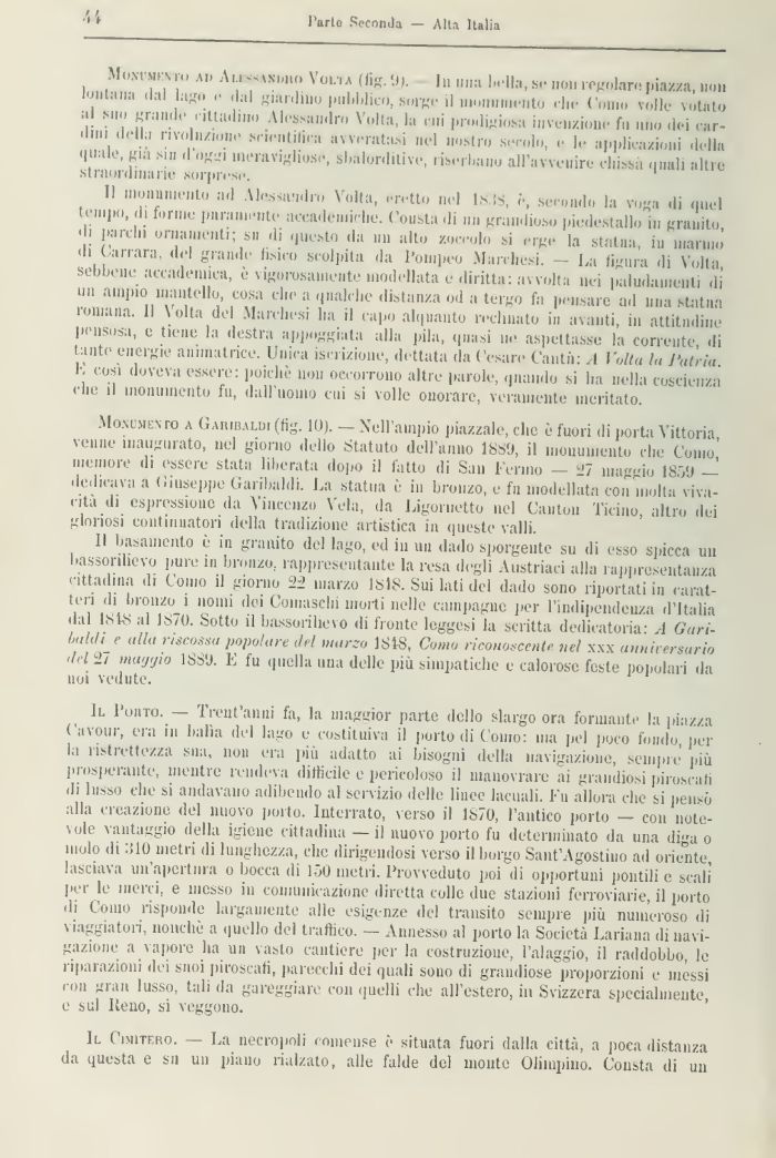 Monumento a Garibaldi (fig. 10). — Nell'ampio piazzale, che è fuori di porta Vittoria, venne inaugurato, nel giorno dello Statuto dell'anno ISSO, il monumento che Como, memore di essere stata liberata dopo il fatto di San Ferino — Il maggio 18.00 — dedicava a Giuseppe Garibaldi. La statua è in bronzo, e fu modellata con molta vivacità di espressione da Vincenzo Vela, da Ligoruetto nel Cantou Ticino, altro dei gloriosi continuatori della tradizione artistica in queste valli.