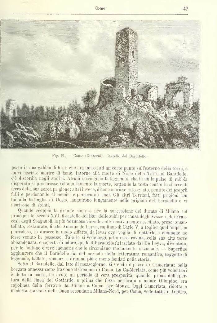 Quando scoppiò la grande contesa per la successione del ducato di Milano sul principio del secolo XVI, il castello del Baradello subì, per causa degli Svizzeri, dei Francesi, degli Spagnuoli, le più fortunose vicende: alternativamente assediato, preso, smantellato, restaurato, finché Antonio eie Lcyva, capitano di Carlo V, a toglier quell'impiccio pericoloso, lo diroccò in modo siffatto, da levar ogni voglia di riattarlo a chiunque ne fosse venuto in possesso. Tale lo si vede oggi, pittoresca rovina, colla sua alta torre abbandonata, e coperta di edere, quale il Baradello fu lasciato dal De Leyva, diventato, per le lontane e vive memorie che lo circondano, monumento nazionale. — Superfluo aggiungere che il Baradello fu, nel periodo della letteratura romantica, soggetto di leggende, ballate, romanzi e drammi più o meno fondati nella storia.