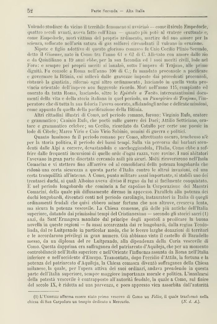 Nipote e figlio adottivo di questo glorioso comasco fu Caio Cecilio Plinio Secondo, detto il Giomne, nato in C'orno tra l'anno GÌ e 02 di C. Allevato con amore dallo zio e da Quintiliano a l'J anni ebbi», per la sua facondia ed suoi ineriti civili, lode nel Foro: e sempre pei proprii meriti si innalzò, sotto 1 impero di Trajano, alle priore dignità. I 11 console a Roma nell'anno lOf) di C. ; fu mandato proconsole a pacificare e governare la Bitinia, cui sollevò dalle gravezze imposte dai precedenti proconsoli, ristaurò la giustizia, riformò ogni altro ordinamento, lasciando in quella vasta provincia orientale dell'impero non fuggevole ricordo. Mori nell'anno 115, compianto ed onorato da tutta Roma, lasciando, oltre le Epistole a Tacito, interessantissimi documenti della vita e della storia italiana in quel periodo, un Panegirico di Trajano, l'imperatore che dì tutta la sua fiducia l'aveva onorato, aflidandogli ardue e delicate missioni, come appunto fu quella della pacificazione della Bitinia.