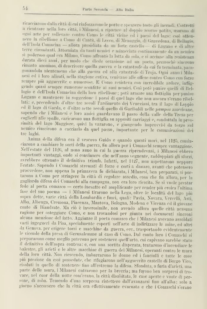 ricacciarono dalla ritti ili cui rinforzarono le porto e .spensero tosto gli incendi. Costretti a rientrare nella loro città, i Milanesi, a riparare ni doppio scorno patito, usarono di ogni arte per sollevare contro Conto le città vicine ed i paesi ilei lago: cosi ottennero la ribellione a Conio di Cantò, di Lecco, di .Menaggio, di Grnvedoiia, di liellagio, dell'Isola Coiiiacina —allora presidiata da mi forte castello ili Lugano e ili altre terre circostanti. Attorniata da tanti nemici e minacciata continuamente ila un nemico si poderoso qual era Milano, Como affrontò la lotta ila sola, e si accinse alla resistenza durata dieci anni, per modo che diede occasione ad un poeta, pressoché .sincrono rimasto anonimo, ili descrivere quella guerra e la catastrofe ila cui fu terminata, paragonandola nientemeno che alla guerra ed alla catastrofe di Troja. (igni anno i Milanesi ed i loro alleati, nella stagione estiva, venivano alle olfese contro Conio con forze sempre più agguerrite e numerose. 10 Como resisteva con incredibile ardore, infliggendo (piasi sempre rumorose sconfitte ai suoi nemici. Così potè punire quelli di liellagio e dell'Isola Comacina della loro ribellione; potè armare una flottiglia per punire Lugano e mantenere iu soggezione i paesi di quel lago che non ancora s'erano ribellati : e, precedendo d'oltre tre secoli l'ardiniento dei Veneziani, tra il lago di Loppio ed il lago di (iarda, e d'oltre Sette secoli quello ili Garibaldi nelle pampas americane, sapendo clic i Milanesi e loro amici guardavano il passo della valle della 'fresa per coglierli alle spalle, caricarono una flottiglia su appositi carriaggi e, condottala in prossimità del lago Maggiore, quivi la vararono, e giungendo improvvisi da tergo sul nemico riuscirono a cacciarlo ila quel passo, importante per le comunicazioni dei tre laghi.