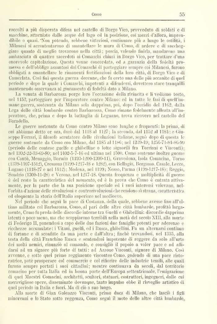 Le guerre sostenute da Como contro Milano sono lunghe e frequenti la prima, di cui abbiamo detto or ora, durò dal 1118 al 1127; la seconda, dal 1152 al 1184: e Giuseppe Ferrari, il filosofo scrutatore delle rivoluzioni italiane, segnò dopo di questa le guerre sostenute da Como con Milano, dal 1185 al 1180; nel 1239-40; 1256-71-84-86-99 (periodo delle contese guelfe e ghibelline o lotte signorili fra Torriani e Visconti); nel 1302-22-33-G9-S0; nel 1402-5-7-16 ed ultima nel 1500. Como sostenne inoltre guerre con Cantù, Menaggio, Bormio (1193-1200-1300-11), Gravedona, Isola Coniatimi, l'orno (.1339-1407-1512), Cremona (1199-1217-18 e 1282), con Bellagio, Bergamo, Casale, Lecco, Lugano (1118-27 e nel 14-12) ; Modena, nel 1199; Nesso, l'arma (1190-1217-18); Reggio, 'Sondrio (1300-11-28) e Verona, nel 1217-1S. Questa frequenza e moltiplicata di guerre è del resto la caratteristica del momento, ed è la prova che Como è entrata attivamente. per la parte che la sua posizione speciale ed i suoi interessi volevano, nell'orbita d'azione delle rivoluzioni e controriv oluzioni che rendono sì strana, caratteristica ed eloquente la storia dell'Italia superiore nel medioevo.