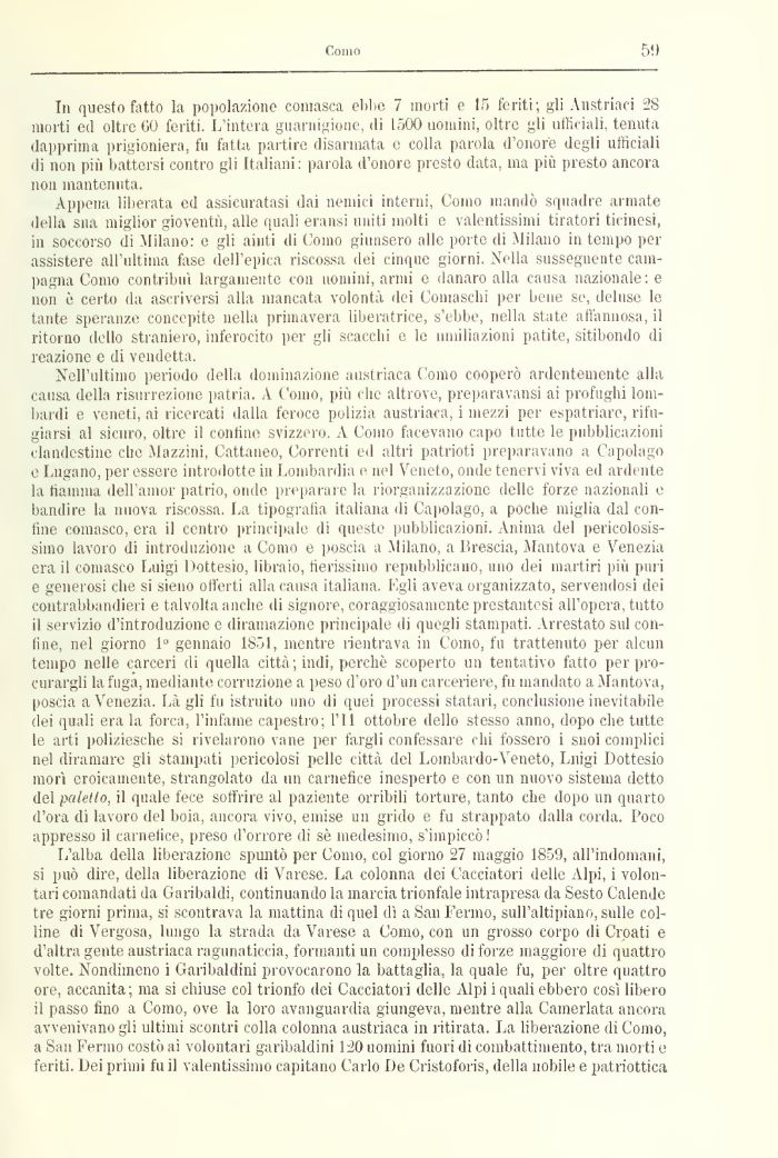 Nell'ultimo periodo della dominazione austriaca Como cooperò ardentemente alla causa della risurrezione, patria. V Como, più che altrove, preparavansi ai profughi lombardi e veneti, ai ricercati dalla feroce polizia austriaca, i mezzi per espatriare, rifugiarsi al sicuro, oltre il contine svizzero. A Como facevano capo tutte le pubblicazioni clandestine clic Mazzini, Cattaneo, Correnti ed altri patrioti preparavano a Capolago e Lugano, per essere introdotte in Lombardia e nel Veneto, onde tenervi viva ed ardente la fiamma dell'amor patrio, onde preparare la riorganizzazione delle forze nazionali e bandire la nuova riscossa. La tipografia italiana di Capolago, a poche miglia dal conline comasco, era il centro principale di queste pubblicazioni. Anima del pericolosissimo lavoro di introduzione a Como e poscia a Milano, a Brescia, .Mantova e Venezia era il comasco Luigi Dottesio, libraio, borissimo repubblicano, uno dei martiri più puri e generosi che si sieno offerti alla causa italiana. Egli aveva organizzato, servendosi dei contrabbandieri e talvolta anche di signore, coraggiosamente prestantesi all'opera, tutto il servizio d'introduzione e diramazione principale di quegli stampati. Arrestato sul confine, nel giorno lu gennaio 1851, mentre rientrava in Como, fu trattenuto per alcun tempo nelle carceri di quella città ; indi, perchè scoperto un tentativo fatto per procurargli la fuga, mediante corruzione a peso d'oro d'un carceriere, fu mandato a Mantova, poscia a Venezia. Là gli fu istruito uno di quei processi statari, conclusione inevitabile dei quali era la forca, l'infame capestro; l'il ottobre dello stesso anno, dopo che tutte le arti poliziesche si melarono vane per fargli confessare chi fossero 1 suoi complici nel diramare gli stampati pericolosi pelle città del Lombardo-Veneto, Luigi Dottesio morì eroicamente, strangolato da un carnefice inesperto e con un nuovo sistema detto del paletto, il quale fece soffrire al paziente orribili torture, tanto che dopo un quarto d'ora di lavoro del boia, ancora vivo, emise un grido e fu strappato dalla corda. Poco appresso il carnefice, preso d'orrore di sè medesimo, s'impiccò !
