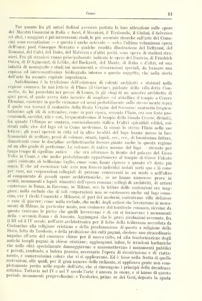 Per quanto fra gli autori italiani avessero portata la loro attenzione sulle opere ilei Maestri (Joniacini in Italia e fuori, il Muratori, il Tiraboschi, il Giulini, il Selvatico ed altri, 1 maggiori e pił interessanti studi, le pił accurate ricerche sull'arte dei Coma-cini sono recentissime e questo č anche notevole salvo l'ultima voluminosa opera dell'onor. prof. Giuseppe Merzario e qualche erudita illustrazione del Beltrami, del Romussi, del Calvi, del lģoito, del Malvezzi e d'altri pochi, sono opera di studiosi stranieri. Fra gli stranieri vanno principalmente indicate le opere del Dartein, di Friedrich Osten, di D'Agincourt, di Liģbkc, del Burkanlt, del Muntz, di Kalm e d'altri, ed una infinitą di monografie e studi sui monumenti e ricostruzioni speciali, da formare una copiosa ed interessantissima bibliografia intorno a questo soggetto, che nella storia dell'arte ha assunto capitale importanza.