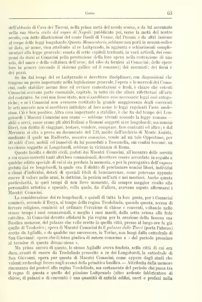 dell'abbazia di Cava dei Tirreni, nella prima metà del secolo scorso, e da lui accennato nella sua Storio civile del regno di Napoli, pubblicato poi, verso la metà del nostro secolo, con dotte illustrazioni elei conte Bandi di \ esine, dal Promis e da altri insieme al coipo delle leggi longobarde. Questo Memorato)-io, sebbene non porti in nessun codice nè data, uè nome, vien attribuito al re Luitprando, in aggiunta e schiarimenti complementari alla legge generale: consta di sette capiteli trattanti. 111 varii articoli, dei coni pensi da darsi ai Comacini pella prestazione della loro opera nella costruzione di una sala, del muro e della voltatimi dell'arco; del cibo da fornirsi ai Comacini; delle opere loro in genere (secondo il sistema gallico od il romano); dei marmisti; dei forni e dei pozzi.
