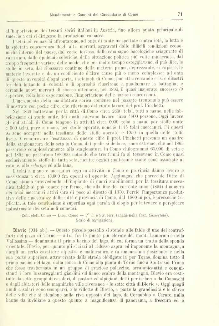 Nel 1860 battevano per la città di Como circa 2800 telai, tutti a mano, nella fabbricazione di stoffe unite, dai quali traevano lavoro circa 1-800 persone. Oggi invece gli industriali di Como tengono in attività circa G000 telai a mano per stoffe unite e 300 telai, pure a mano, per stoffe operate, nonché 111-5 telai meccanici. Di questi 05 sono occupati nella tessitura delle stoffe operate e 1050 in quella delle stoffe liscie. A comprovare l'esattezza di queste cifre il prof. l'inchetti presenta un quadro della stagionatura della seta in Como, dal quale si deduce, rome estremo, che nel 1805 passarono complessivamente alla stagionatura in Como chilogrammi 05.000 di seta e nel 1S92 ne passarono 18S.000, notando che trent'anni fa si tessevano in Como quasi esclusivamente stoffe in tutta seta, mentre oggidì moltissime stoffe sono associate al cotone, allo sciitippe ed alla lana.