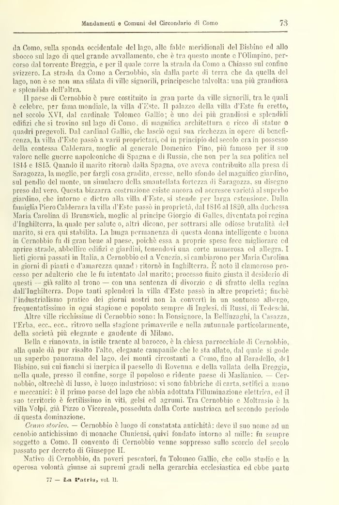 Il paese dì Cernobbio è pure costituito in gran parte da ville signorili, tra le quali e celebre, per fama mondiale, la villa d'Este. II palazzo della villa d'Kste fu eretto, nel secolo XVI, dal cardinale Tolomeo Gallio; è uno dei più grandiosi e splendidi edilizi che si trovino sul lago di Como, di magnifica architettura e ricco di statue e quadri pregevoli. Dal cardinal Gallio, che lasciò ogni sua ricchezza in opere di beneficenza, la villa d'Este passò a varìi proprietari, ed 111 principio del secolo era in possesso della contessa Calderara, moglie al generale Domenico Tino, più famoso per il suo valore nelle guerre napoleoniche di Spagna e di Russia, che non per la sua politica nel 1814 e 1815. Quando il marito ritornò dalla Spagna, ove aveva contribuito alla presa di Saragozza, la moglie, per fargli cosa gradita, eresse, nello sfondo del magnifico giardino, sul pendìo del monte, un simulacro della smantellata fortezza di Saragozza, su disegno preso dal vero. Questa bizzarra costruzione esiste ancora ed accresce varietà al superbo giardino, che intorno e dietro alla villa d'Este, si stende per larga estensione. Dalla famiglia Piero Calderara lavila d'Este passò in proprietà, dal ISIGal ISSO, alla duchessa Maria Carolina di Brunswich, moglie al principe Giorgio di Galles, diventata poi regina d'Inghilterra, la quale per salute o, altri dicono, per sottrarsi alle odiose brutalità del marito, si era qui stabilita. La lunga permanenza di questa donna intelligente e buona in Cernobbio fu di gran bene al paese, poiché essa a proprie spese fece migliorare ed aprire strade, abbellire edifìzi e giardini, tenendovi una corte numerosa ed allegra. I lieti giorni passati in Italia, a Cernobbio ed a Venezia, si cambiarono per Maria Carolina in giorni di pianti e d'amarezza qnand ) ritornò in Inghilterra. È noto il clamoroso processo per adulterio che le fu intentato dal marito; processo finito giusta il desiderio di questi — già salito al trono — con una sentenza di divorzio e di sfratto della regina dall'Inghilterra. Dopo tanti splendori la villa d'Este passò in altre proprietà; finché l'industrialismo pratico dei giorni nostri non la convertì in un sontuoso albergo, frequentatissimo in ogni stagione e popolato sempre di Inglesi, di Russi, di Tedeschi.