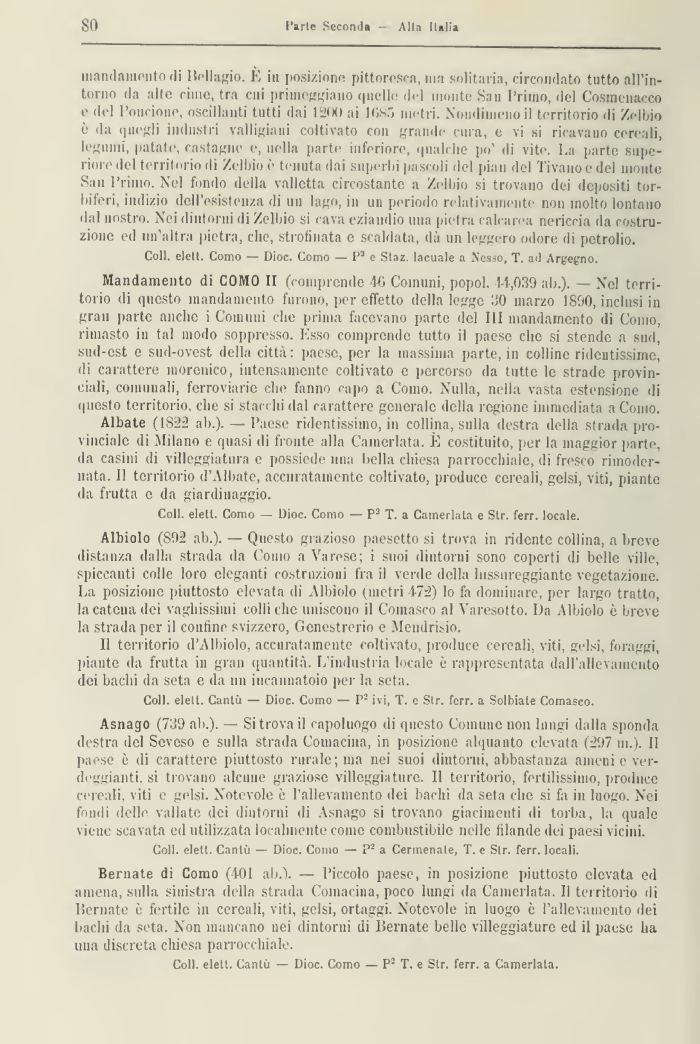 mandamento di Helhigio. E in posizione pittoresca, ina solitaria, circondato tutto all'intorno da alto rime, tra cui primeggiano quello del monte San Primo, del Cosmcn&cco e del Poncione, oscillanti tutti dai 1200 ai 10S5 metri. Nondimeno il territorio di Zelbio è da quegli industri valligiani coltivato con grande cura, e vi si ricavano cereali, legumi, patate, castagne e, nella parte inferiore, qualche po' di vite. La parte supcriore del territorio di Zelino è tenuta dai superili pascoli del pian del 'l'ivano e del monte San Primo. Nel fondo della valletta circostante a Zelbio si trovano dei depositi tor-biferi, indizio dell'esistenza di un lago, in un periodo relativamente non molto lontano dal nostro. Nei dintorni di Zelbio si cava eziandio una pietra calcarea nericcia ila costruzione ed un'altra pietra, che, strofinata e scaldata, dà un leggero odore di petrolio.