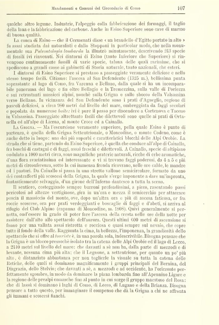 La Grigna. — Ma l'escursione veramente superiore, polla quale Esino è punto di partenza, è quella della Grigna Settentrionale, o Moncodine, o monte Codeno, come è anche detto in luogo: uno dei più superbi e caratteristici blocchi delle Alpi Orobie. La strada che si tiene, partendo da Esino Superiore, è quella che conduce all'alpe di Camallo, fra boschi di castagni e di faggi, assai freschi e dilettevoli. A Camallo, specie di altipiano ondulato a 1000 metri circa, sono magnifiche praterie naturali, ricche di erbe aromatiche, d'una fiora svariatissiuia ed interessante e vi si trovano faggi poderosi, da 4 a 5 e più metri di circonferenza, sotto la cui immensa fronda ricovrano, nelle ore calde, le mandre ed i pastori. Da Camallo si passa in uno stretto vallone semicircolare, formato da uno dei contrafforti più scoscesi della Grigna, la quale s'erge imponente a dare un'impronta, fantasticamente selvaggia, d'un girone dell'Inferno dantesco a tutta la scena.