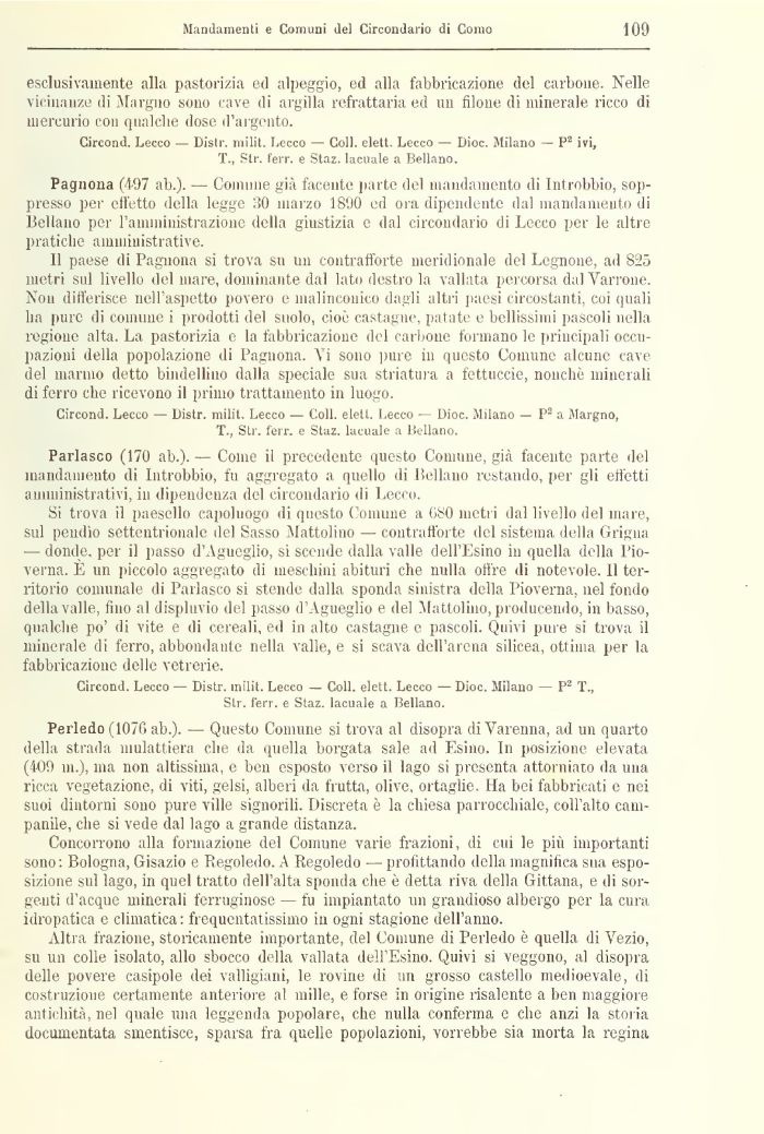 Parlasco (170 ab.). — Come il precedente questo Comune, già facente parte del mandamento di Introbbio, fu aggregato a quello di Bellano restando, per gli effetti amministrativi, iu dipendenza del circondario di Lecco.