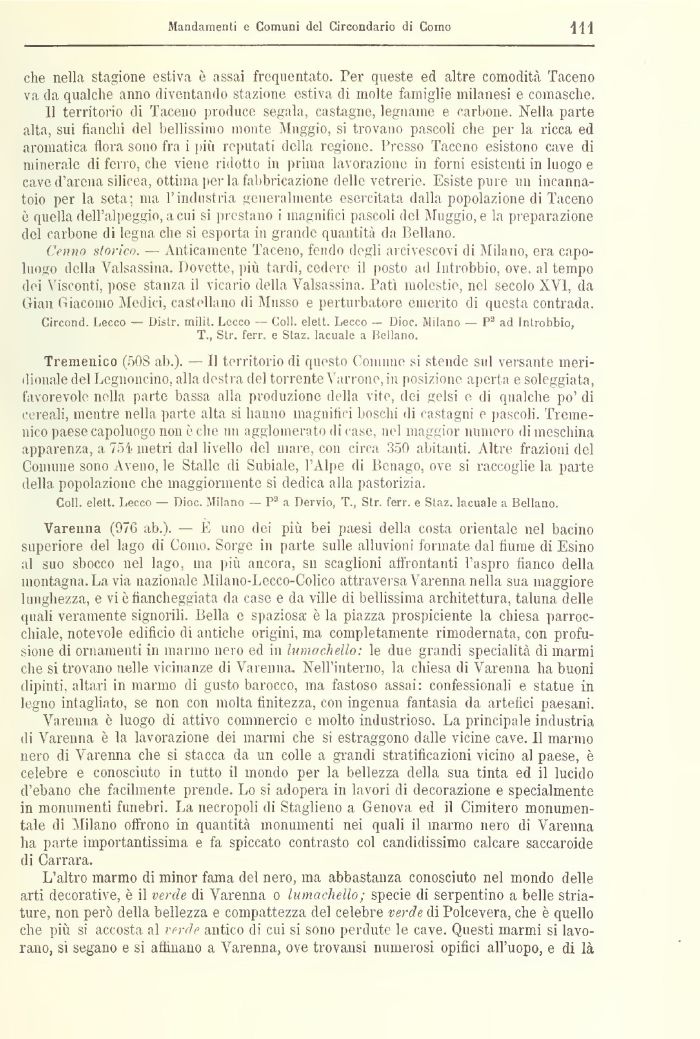 L'altro marmo di minor fama del nero, ma abbastanza conosciuto nel mondo delle arti decorative, è il verde di Varenna 0 lumachello; specie di serpentino a belle stria-ture, non però della bellezza e compattezza del celebre verde di Polcevera, che è quello che più si accosta al verde antico di cui si sono perdute le cave. Questi marmi si lavorano, si segano e si aflinano a Varenna, ove trovansi numerosi opifici all'uopo, e di là
