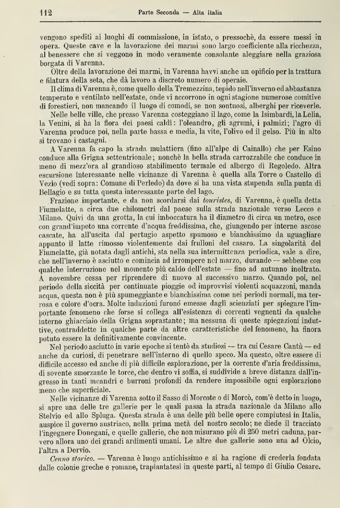 Frazione importante, e da non scordarsi dai tauristes, di Varenna, è quella detta Fiumelatte, a circa due chilometri dal paese sulla strada nazionale verso Lecco e Milano. Quivi da una grotta, la cui imboccatura ha il diametro di circa un metro, esce con grand'inipeto una corrente d'acqua freddissima, che, giungendo por interne ascose cascate, ha all'uscita dal pertugio aspetto spumoso e bianchissimo da uguagliare appunto il latte rimosso violentemente dai frulloni del casaro. La singolarità del Fiumelatte, già notata dagli antichi, sta nella sua intermittenza periodica, vale a dire, che nell'inverno è asciutto e comincia ad irrompere nel marzo, durando — sebbene con qualche interruzione nel momento più caldo dell'estate — fino ad autunno inoltrato. A novembre cessa per riprendere di nuovo al successivo marzo. Quando poi, nel periodo della siccità per continuate pioggie od improvvisi violenti acquazzoni, manda acqua, questa non è più spumeggiante e bianchissima come nei periodi normali, ma terrosa e colore d'ocra. Molte induzioni furono emesse dagli scienziati per spiegare l'importante fenomeno che forse si collega all'esistenza di correnti vegnenti da qualche interno ghiacciaio della Griglia soprastante ; ma nessuna di queste spiegazioni induttive, contraddette in qualche parte da altre caratteristiche del fenomeno, ha finora potuto essere la definitivamente convincente.
