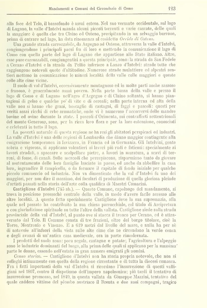 Cenno storico. — Castiglione d'Intelvi non ha storia propria notevole, che non si colleglli intimamente con quella della regione circostante e di tutta la diocesi comasca. Fra t fatti importanti della vai d'Intelvi si ricordano l'insurrezione di questi valligiani nel 1807, contro il dispotismo dell'impero napoleonico; più tardi il tentativo di insurrezione promosso, nel 1849, in questa vallata da Giuseppe Mazzini, tentativo del quale caddero vittime del piombo austriaco il Brenta e due suoi compagni, tragico