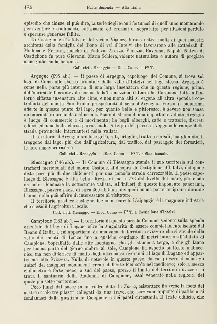 Blessagno (446 ab.). — Il Comune di Blessagno stende il suo territorio sui contrafforti meridionali del monte Costone, al disopra di Castiglione d'Intelvi, dal quale dista poco più di dne chilometri per una comoda strada carrozzabile. 11 paese capoluogo di Blessagno è alla bella altezza di metri 773 dal livello del mare, per modo da poter dominare la sottostante vallata. All'infuori di questo imponente panorama, Blessagno, povero paese di circa 300 abitanti, dei quali buona parte emigrano durante l'anno, nulla può offrire di interessante al visitatore.