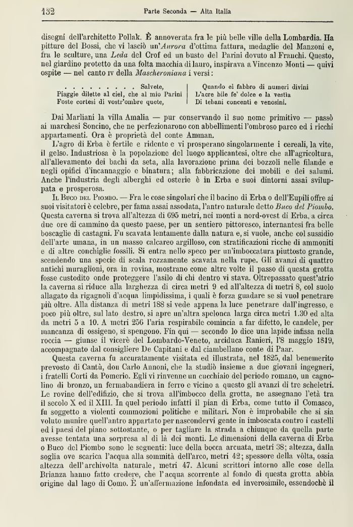 Il Buco del Piombo. — F'ra le cose singolari che il bacino di Erba o dell'Eupili offre ai suoi visitatori è celebre, per fama assai assodata, l'antro naturale detto Buco del Piombo. Questa caverna si trova all'altezza di 695 metri, nei monti a nord-ovest di Erba, a circa due ore di cammino da questo paese, per un sentiero pittoresco, internantesi fra belle boscaglie di castagni. Fu scavata lentamente dalla natura e, si vuole, anche col sussidio dell'arte umana, in un masso calcareo argilloso, con stratificazioni ricche di ammoniti e di altre conchiglie fossili Si entra nello speco per un'imboccatura piuttosto grande, scendendo una specie di scala rozzamente scavata nella rupe. Gli avanzi di quattro antichi muraglioni, ora in rovina, mostrano come altre volte il passo di questa grotta fosse custodito onde proteggere l'asilo di chi dentro vi stava. Oltrepassato quest'atrio la caverna si riduce alla larghezza di circa metri 9 ed all'altezza di metri 8, col suolo allagato da rigagnoli d'acqua limpidissima, i quali è forza guadare se si vuol penetrare più oltre. Alla distanza di metri 1S8 si vede appena la luce penetrare dall'ingresso, e poco più oltre, sul lato destro, si apre un'altra spelonca larga circa inetri 1.30 ed alta da metri 5 a 10. A metri 256 l'aria respirabile comincia a far difetto, le candele, per mancanza di ossigeno, si spengono. Fin qui — secondo lo dice una lapide infissa nella roccia — giunse il viceré del Lombardo-Veneto, arciduca Ranieri, 18 maggio 1819, accompagnato dal consigliere De Capitani e dal ciambellano conte di Taar.