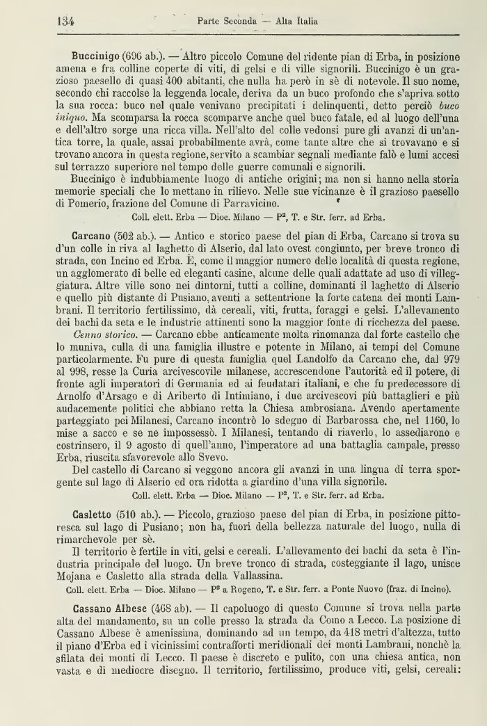 Bucciuigo (09(3 ab.) — Altro piccolo Comune del ridente pian di Erba, in posizione amena e fra colline coperte di viti, di gelsi e di ville signorili. Buccinigo è un grazioso paesello di quasi 400 abitanti, che nulla ha però in se di notevole, Il suo nome, secondo chi raccolse la leggenda locale, deriva da un buco profondo che s'apriva sotto la sua rocca: buco nel quale venivano precipitati i delinquenti, detto perciò buco iniquo. Ma scomparsa la rocca scomparve anche quel buco fatale, ed al luogo dell'una e dell'altro sorge una ricca villa. Nell'alto del colle vedonsi pure gli avanzi di un'antica torre, la quale, assai probabilmente avrà, come tante altre che si trovavano e si trovano ancora in questa regione, servito a scambiar segnali mediante falò e lumi accesi sul terrazzo superiore nel tempo delle guerre comunali e signorili.
